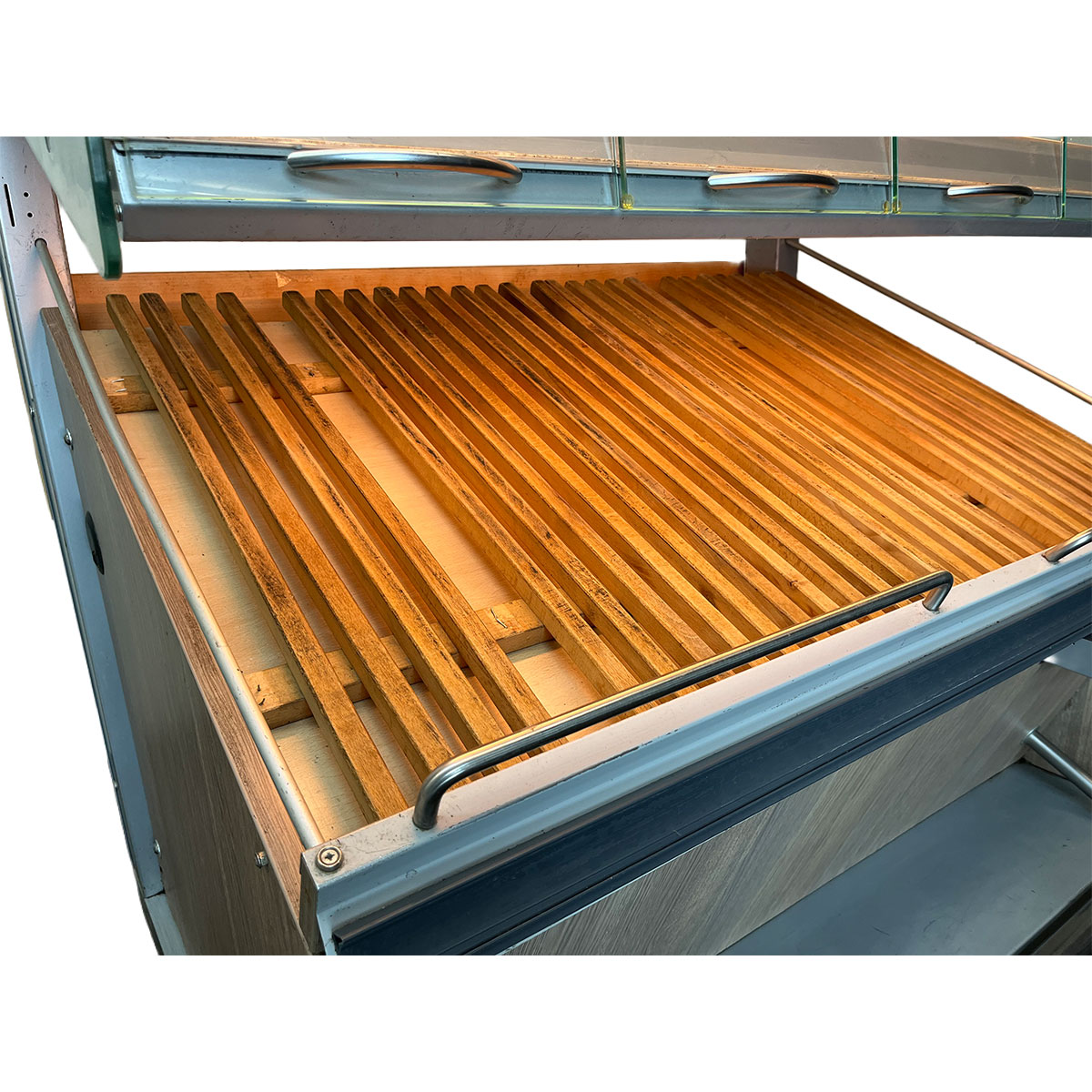 Dieses gebrauchte Backwarenregal mit Plexiglasklappen ist eine wirtschaftliche und platzsparende Alternative zur Neuanschaffung. Das Regal ist stabil, funktional und sofort einsatzbereit – ideal für eine professionelle und verkaufsfördernde Präsentation Ihrer Backwaren.