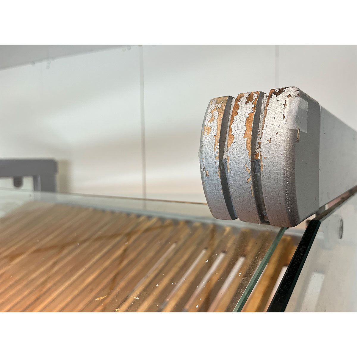 Die Holzroste weisen Gebrauchsspuren auf und sind teilweise defekt (siehe Bilder). Das Regal ist dennoch voll funktionsfähig und kann je nach Bedarf aufgearbeitet.