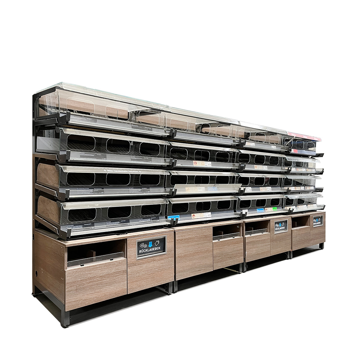 Ein besonderes Highlight sind die nach vorne herausziehbaren Auslagefächer. Dadurch können die Fächer direkt von vorne befüllt werden, ohne dass das Personal hinter das Regal treten muss. Dies erleichtert das Nachfüllen der Ware und ermöglicht eine effiziente Bestückung – ideal für geschäftige Verkaufsflächen mit hohem Kundenaufkommen.