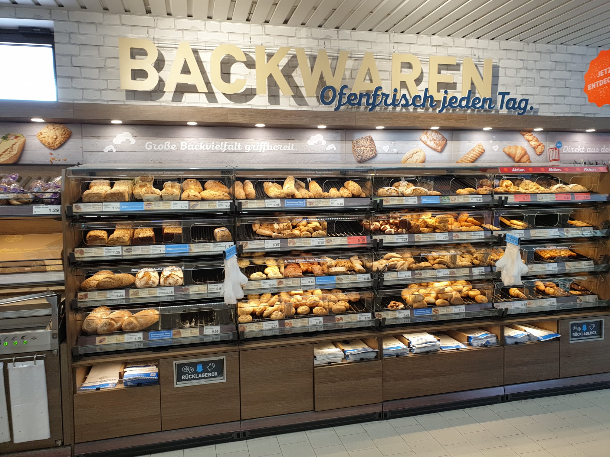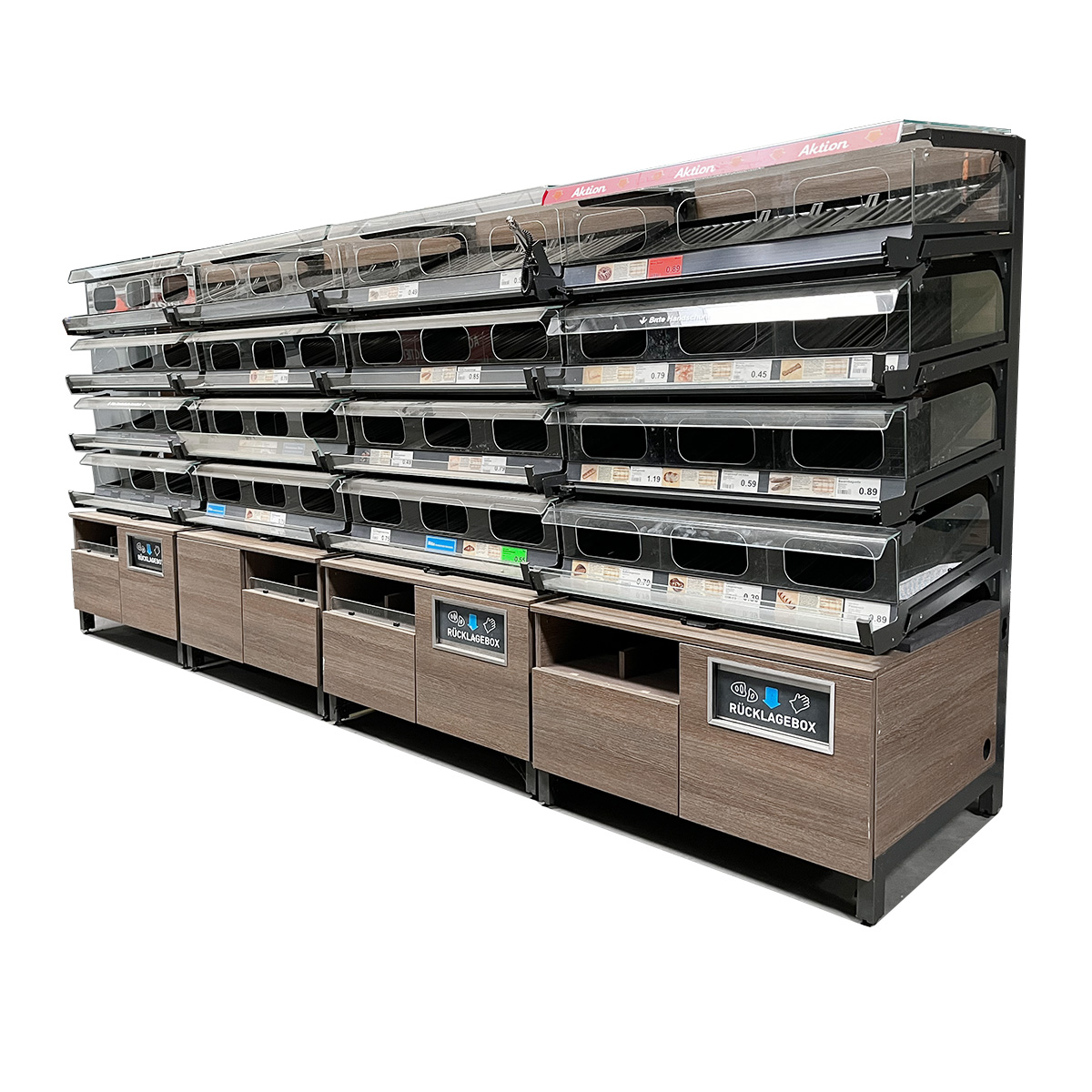 Im unteren Bereich des Regals befinden sich spezielle Fächer für Brottüten. Diese ermöglichen es den Kunden, ihre Backwaren direkt vor Ort zu verpacken. Die Brottüten sind leicht zugänglich und sorgen für eine reibungslose und bequeme Handhabung beim Einkauf.