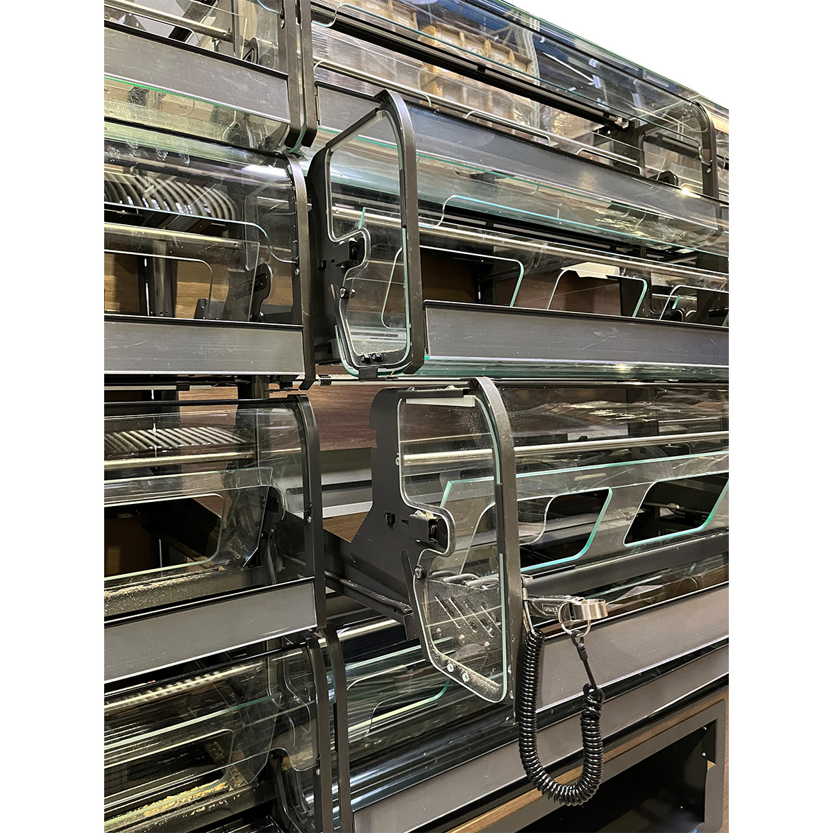 Das Bake-Off-Regal ist mit insgesamt 16 Auslagefächern ausgestattet, wobei jede der vier Einheiten vier großzügige Fächer besitzt. Die Fächer sind mit transparenten Plexiglasscheiben versehen, sodass die Kunden einen klaren Blick auf die angebotenen Backwaren haben. Gleichzeitig schützt die Verglasung die Ware vor äußeren Einflüssen und sorgt für mehr Hygiene im Verkaufsbereich.