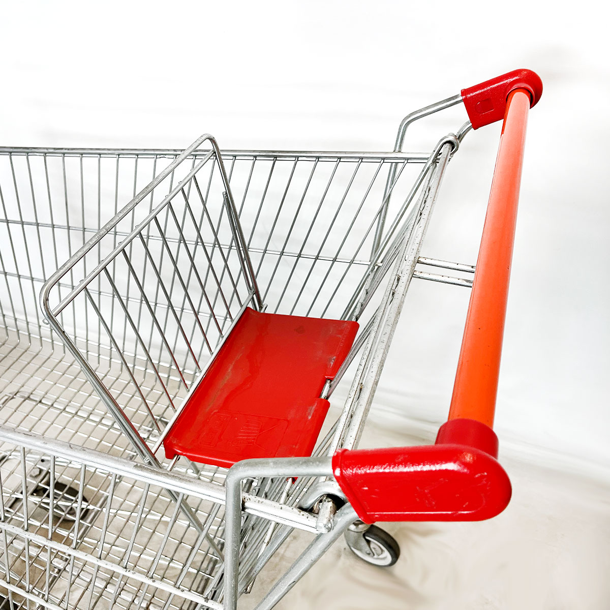 Ein besonderes Ausstattungsmerkmal ist der rote Kindersitz, der im vorderen Bereich des Wagens integriert ist. So können Eltern mit Kleinkindern bequem und sicher einkaufen, während das Kind im Sitz Platz findet.