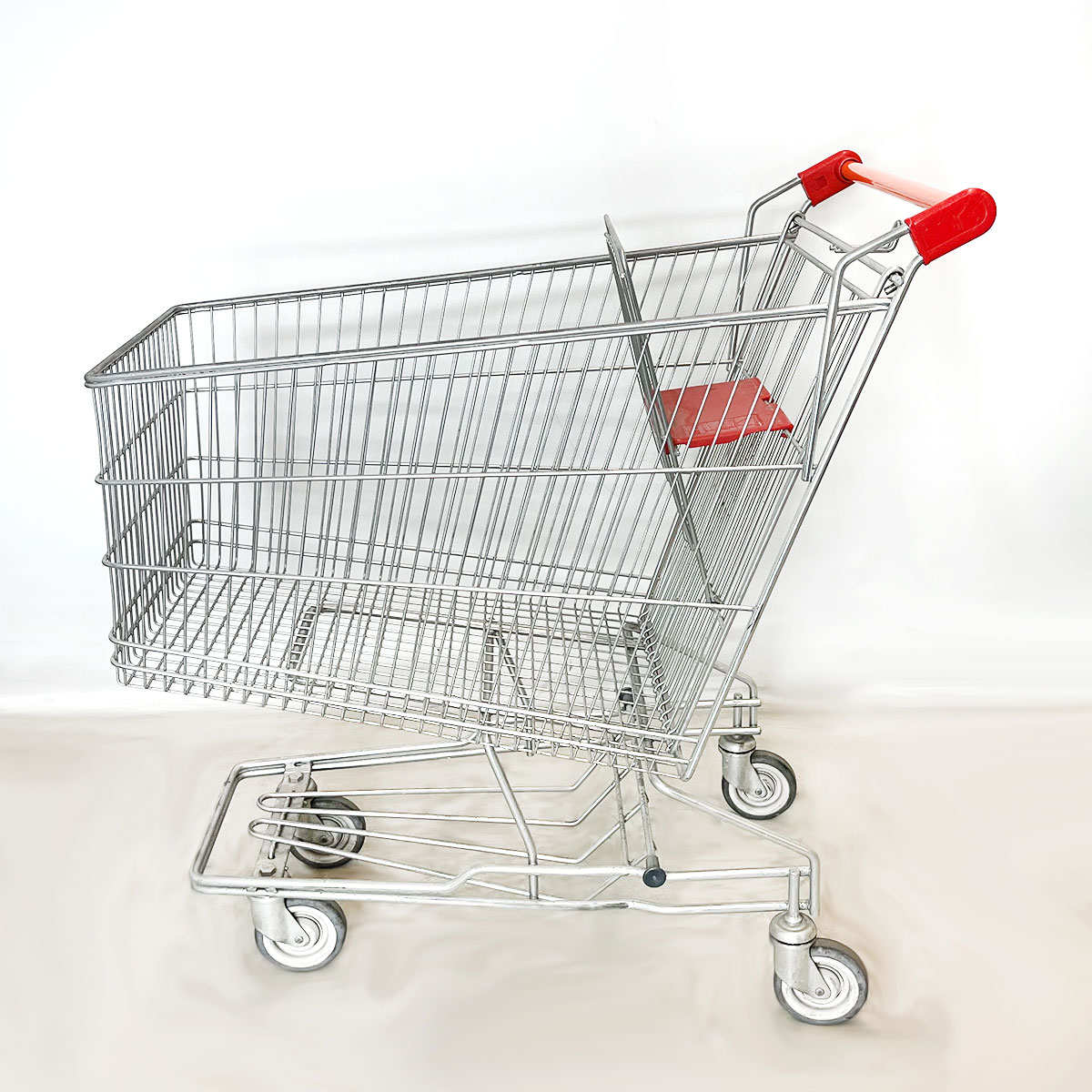 Der Einkaufswagen verfügt über einen stabilen Drahtkorb, der mit 180 Litern Fassungsvermögen großzügigen Stauraum für Produkte aller Art bietet – von Lebensmitteln über Haushaltswaren bis hin zu Getränken und sperrigeren Artikeln. Die klassische Form des Korbs gewährleistet dabei eine einfache Beladung und gute Übersichtlichkeit beim Einräumen.