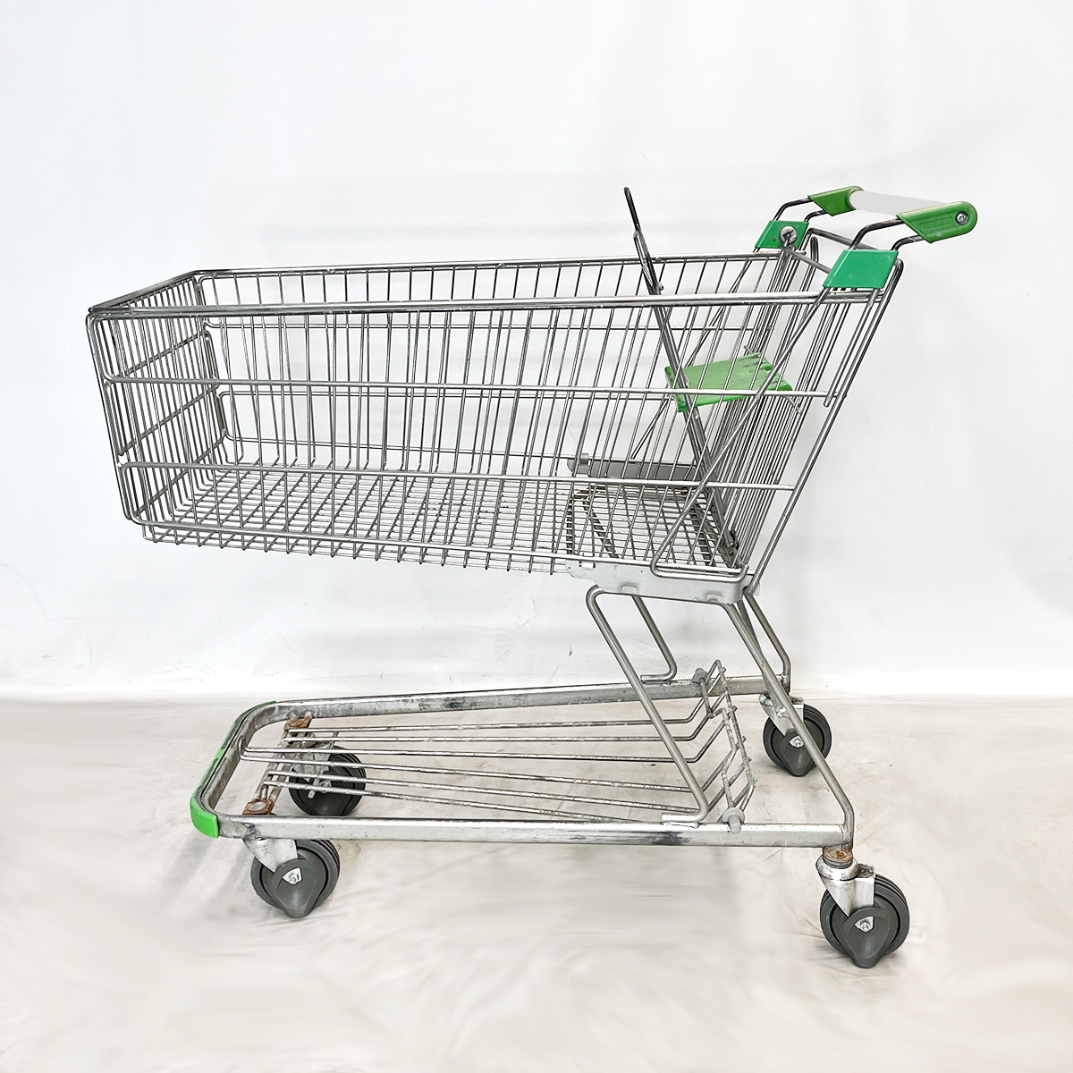Ein besonderes Highlight ist der grüne Kindersitz, der fest integriert und ergonomisch gestaltet ist. Er bietet Kindern bis zu einem bestimmten Alter eine sichere und bequeme Sitzgelegenheit, während die Eltern ungestört einkaufen können. Der farbenfrohe Sitz bringt nicht nur Funktionalität, sondern auch ein ansprechendes Design in den Wagen.