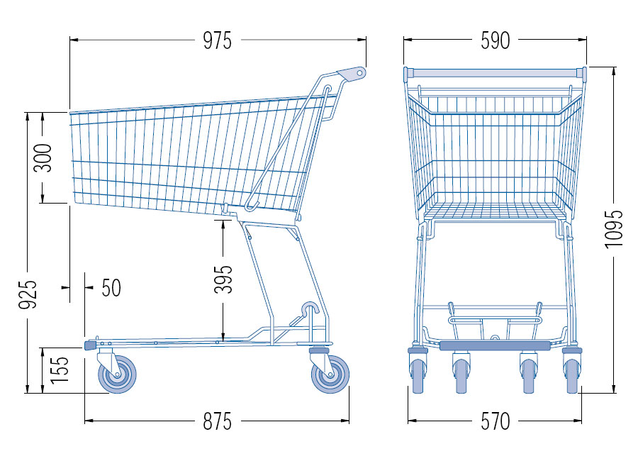 Die Serie DRC bietet, besonders auch durch den großflächigen serienmäßigen Bodenrost, enorm viel Raum für Einkäufe. Hier passen zwei Getränkekisten mit max. 1,5 Liter-Flaschen oder auch andere sperrige Güter drauf. Auch sehr kleine Artikel sind in diesem formstabilen Einkaufswagen gut aufgehoben, da er passgenau gearbeitet und sehr engmaschig gebaut wurde. Die Einkaufswagen sind platzsparend ineinanderschiebbar.