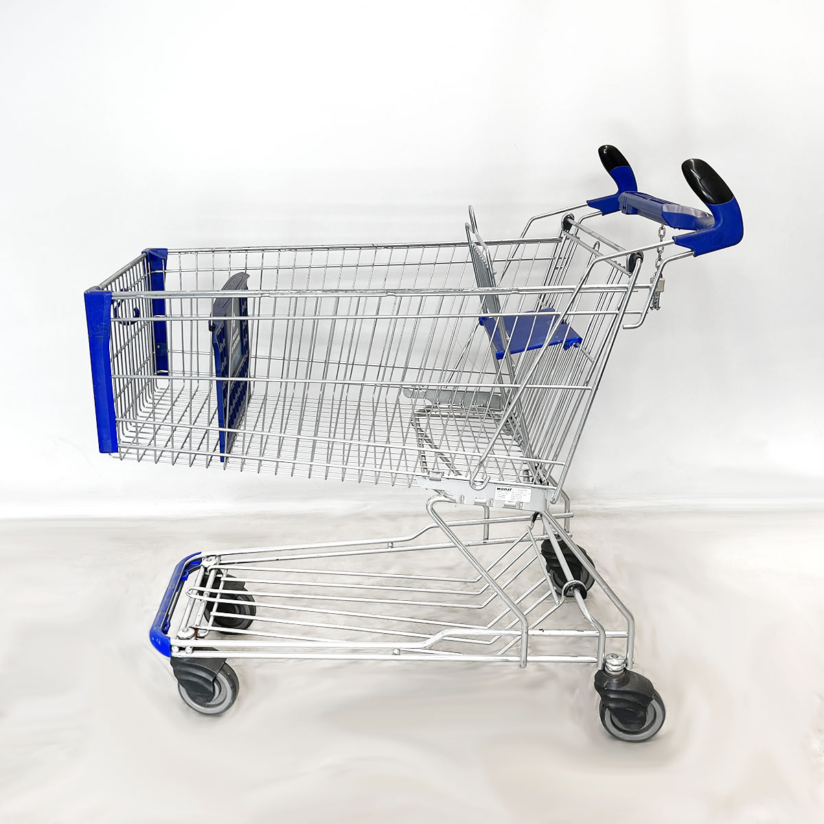 Ein besonderes Highlight ist der integrierte Kindersitz mit blauer Sitzfläche, der es Eltern ermöglicht, ihre Kinder sicher und bequem während des Einkaufs zu transportieren.