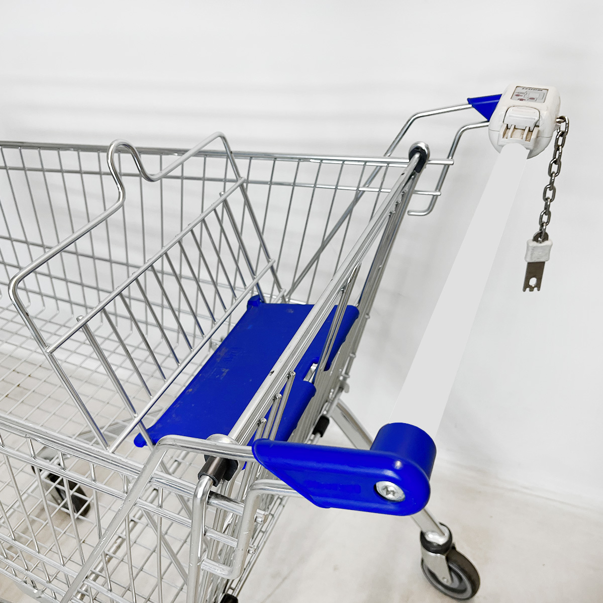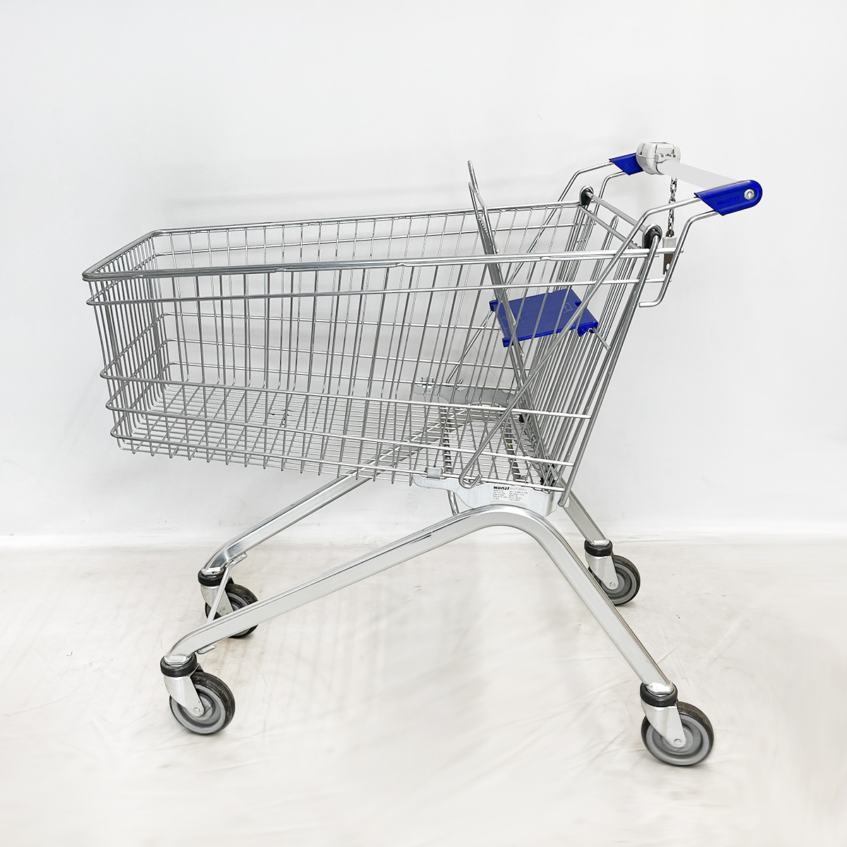 Dieser Einkaufswagen von Wanzl der Serie EL umfasst ein Korbvolumen von 132 Litern und ist mit einem blauen Kindersitz ausgestattet.
