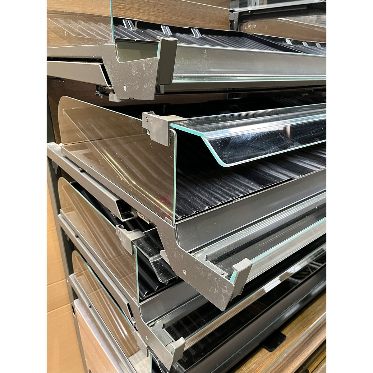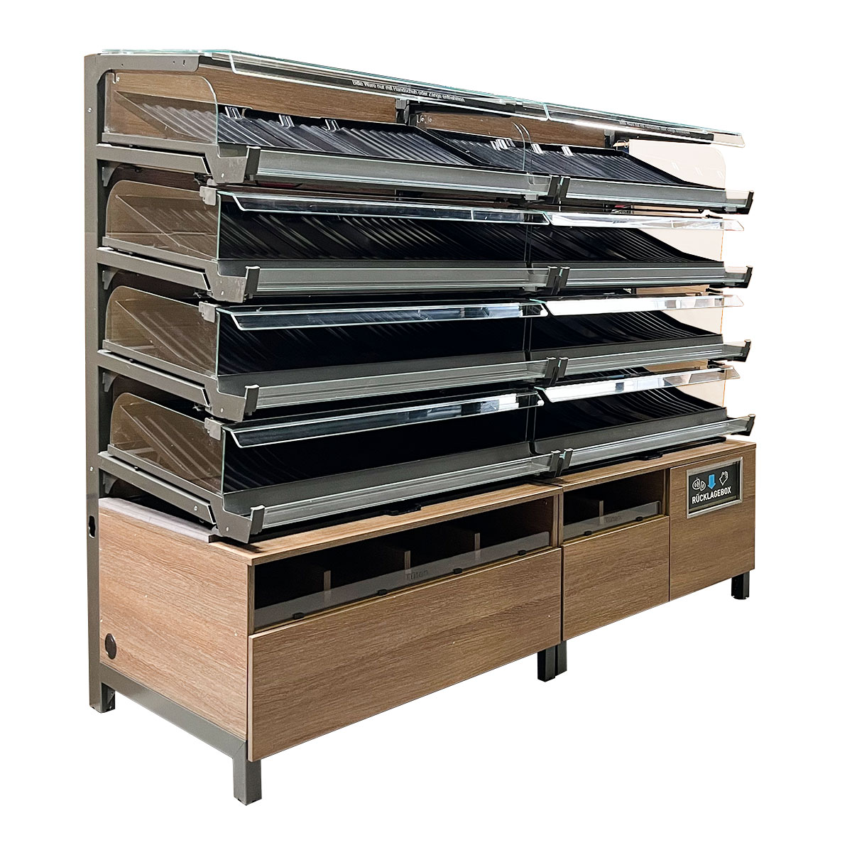 The base of the shelf features practical storage compartments for bread bags, allowing customers to conveniently serve themselves. An integrated waste compartment is also built in. This feature contributes to order at the sales counter and supports smooth daily operations.