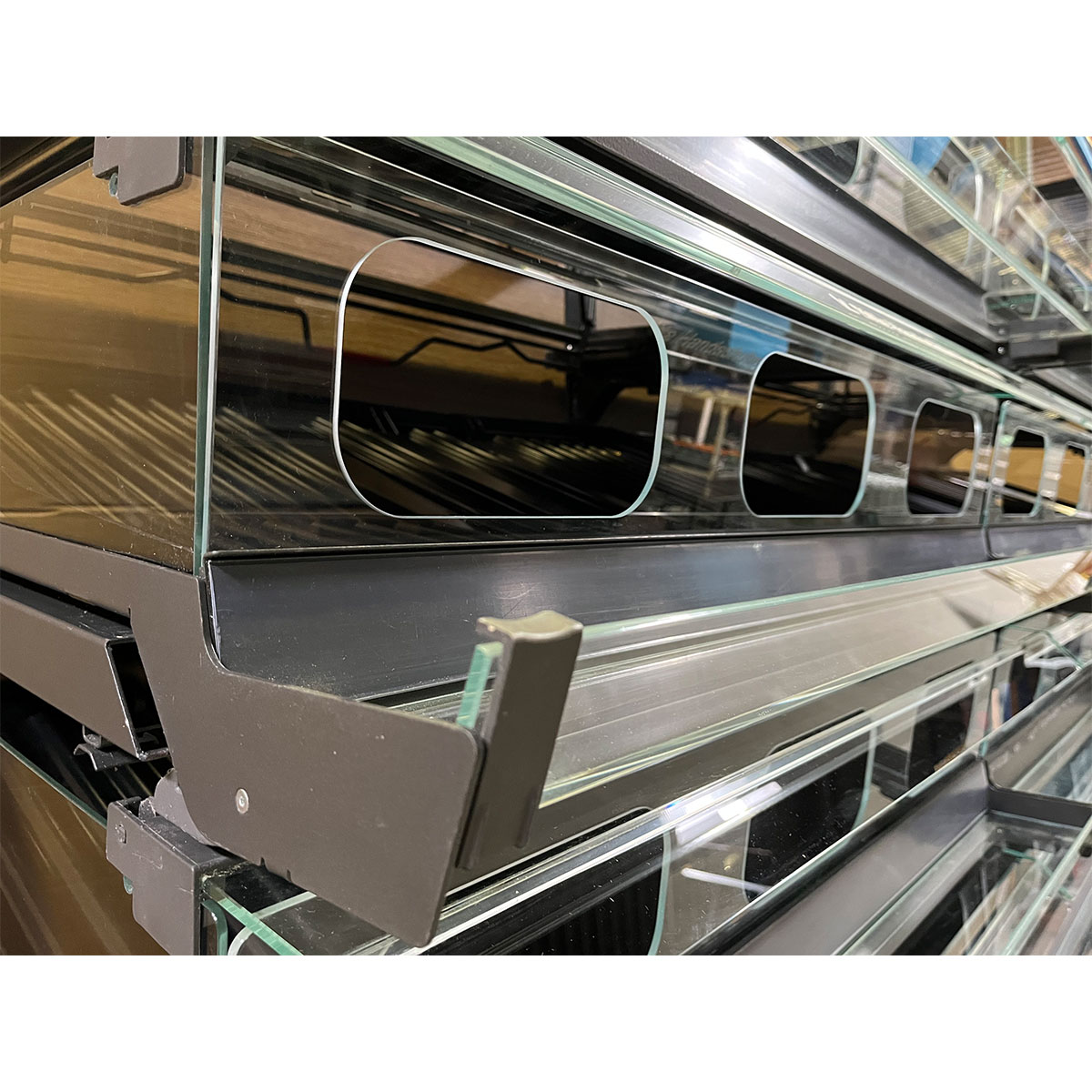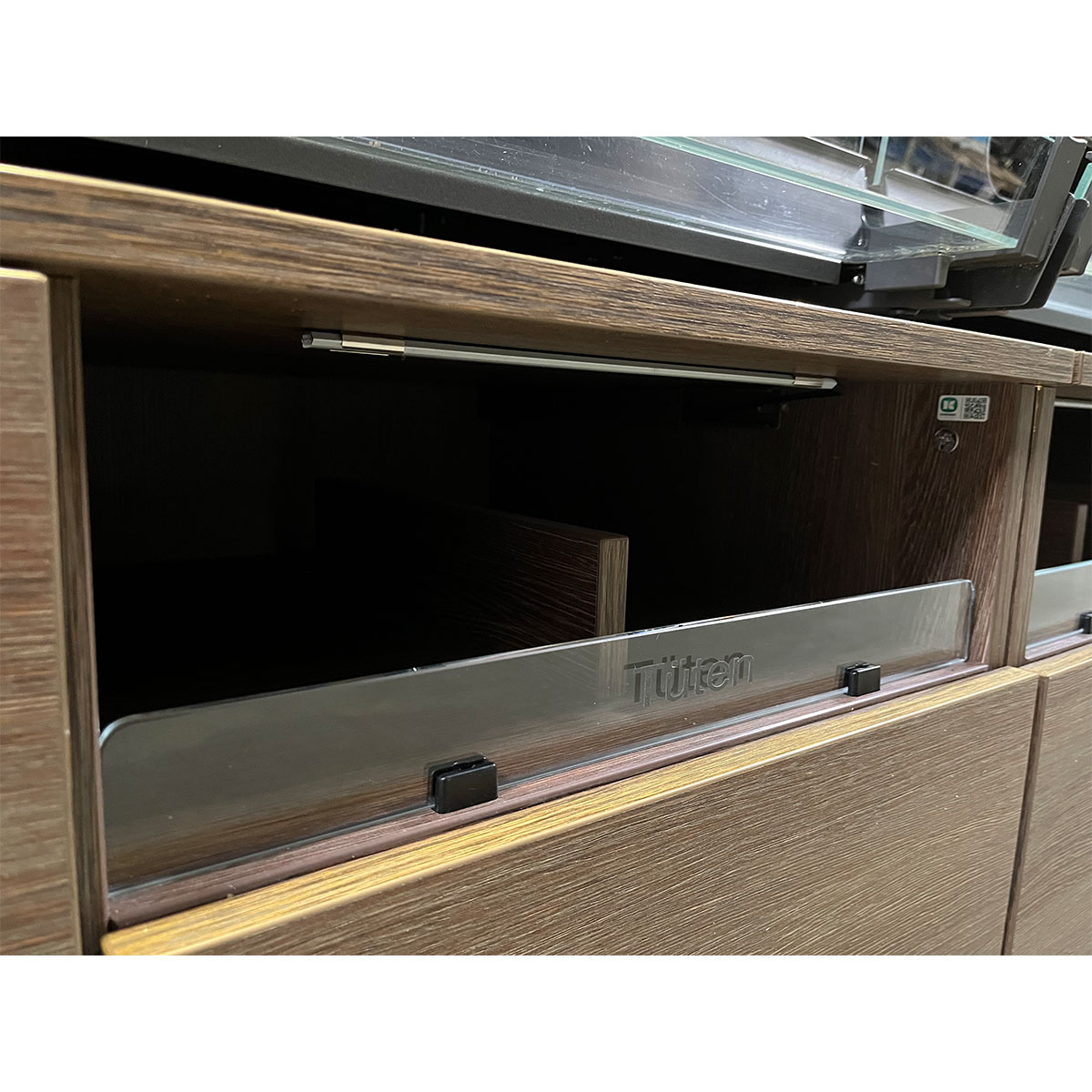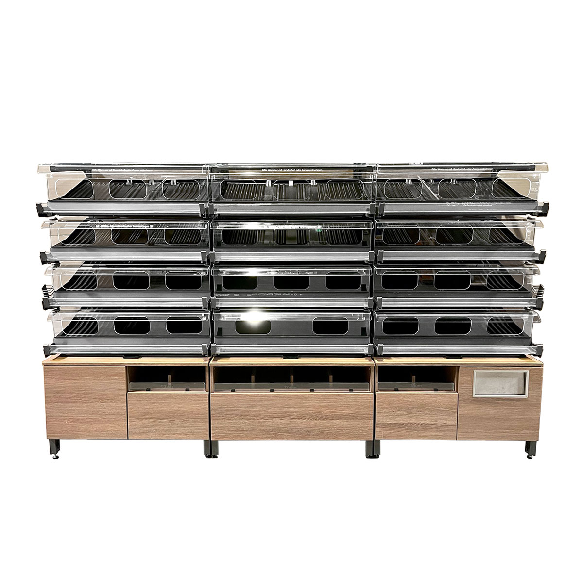 The shelving consists of three modular units, each 1 meter wide. Each unit has four spacious compartments, which can be pulled out from the front for easy refilling. The compartments are equipped with transparent Plexiglas panels that hygienically protect the products while allowing for an attractive presentation. Thanks to well-designed openings in the Plexiglas panels, customers can easily access the baked goods with tongs without directly touching the product.