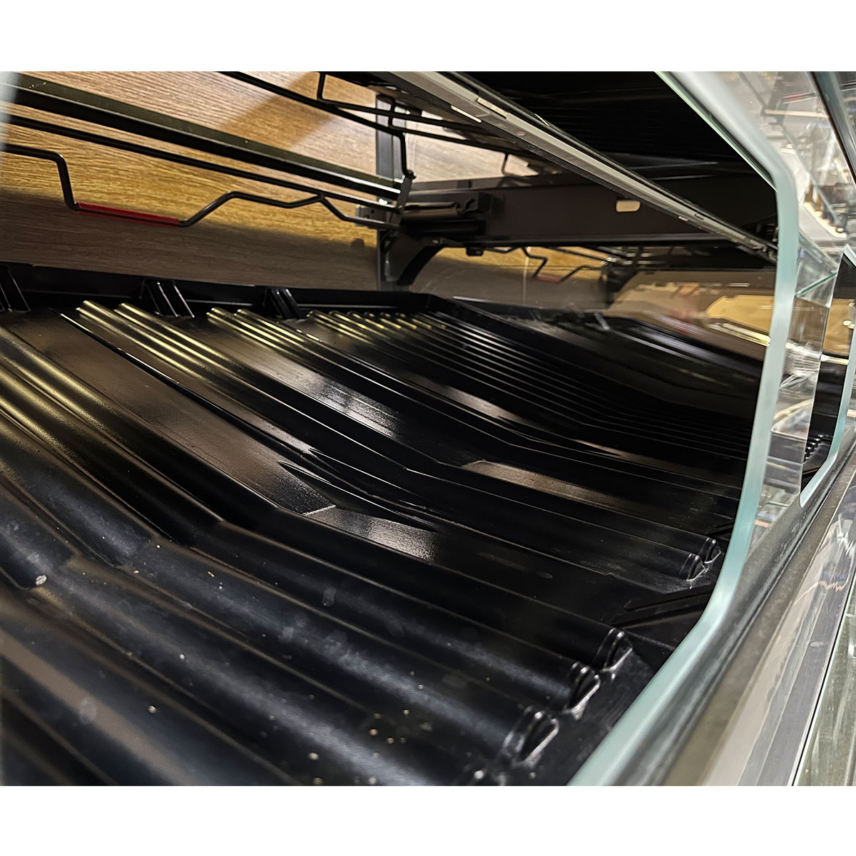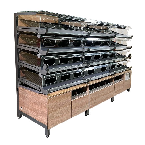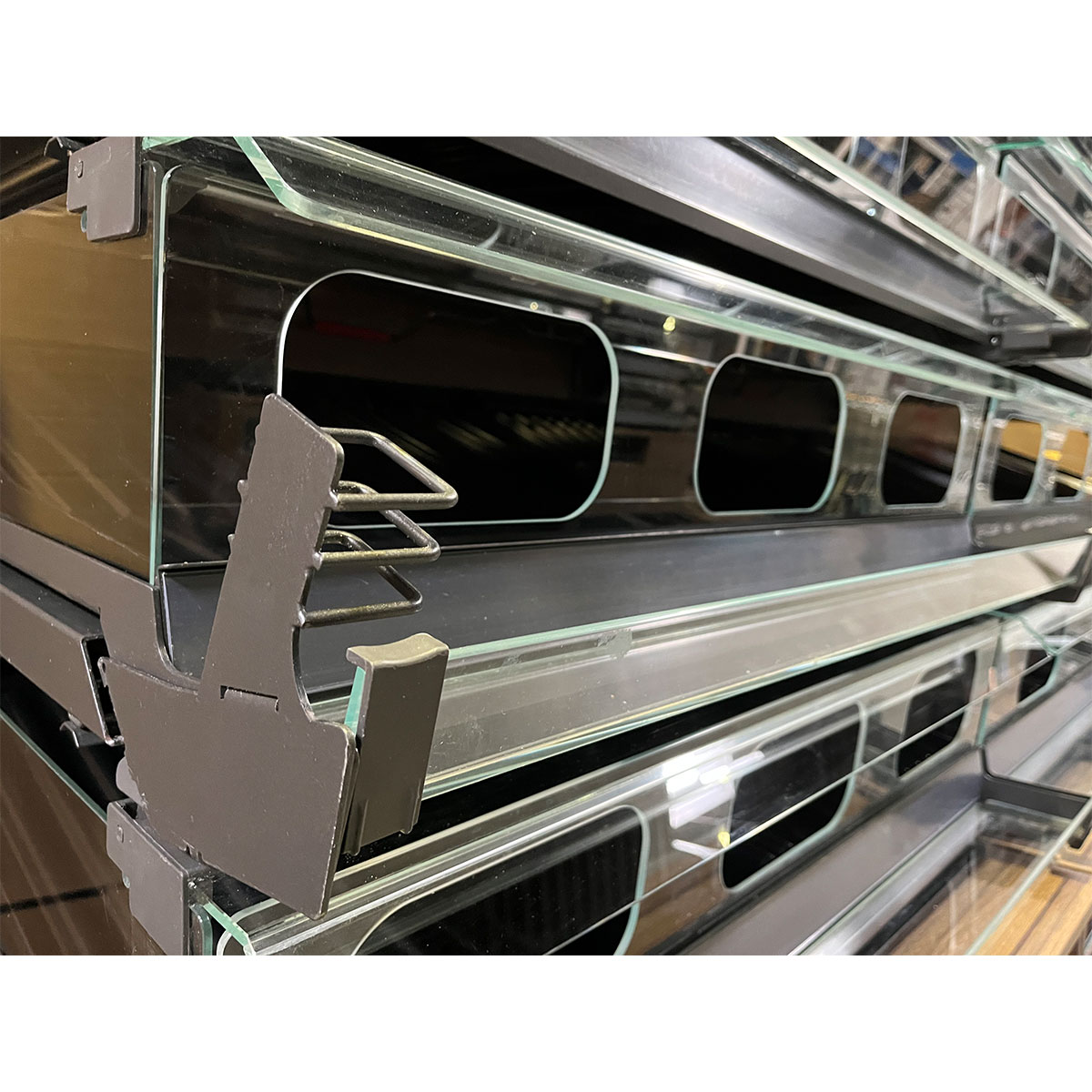 The shelving consists of three modular units, each 1 meter wide. Each unit has four spacious compartments, which can be pulled out from the front for easy refilling. The compartments are equipped with transparent Plexiglas panels that hygienically protect the products while allowing for an attractive presentation. Thanks to well-designed openings in the Plexiglas panels, customers can easily access the baked goods with tongs without directly touching the product.