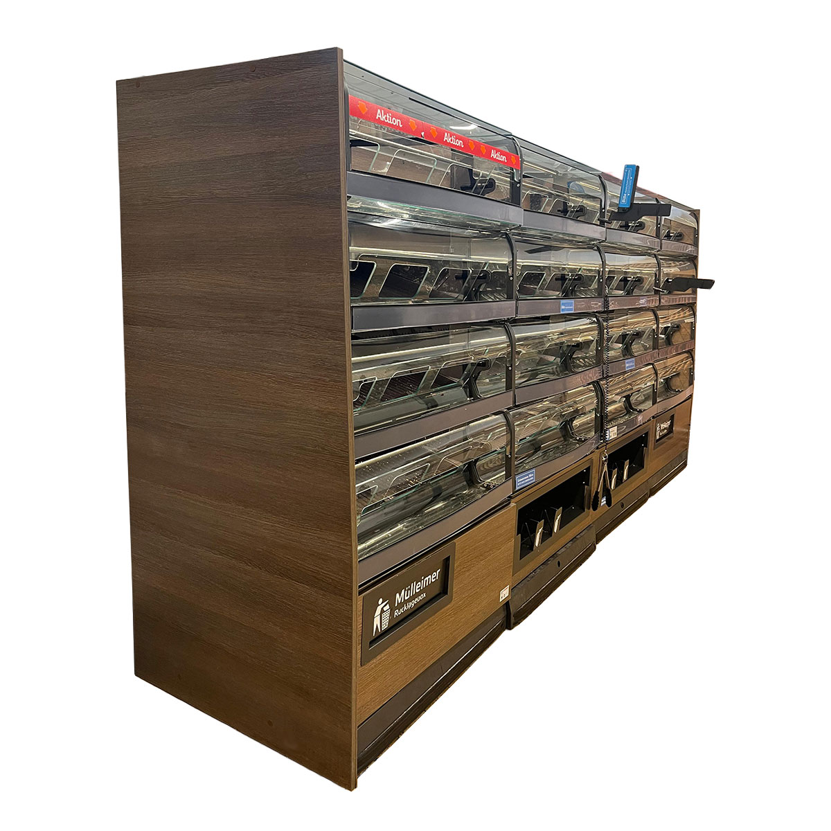 A special highlight is the front-mounted display compartments. This allows the compartments to be filled directly from the front without staff having to step behind the shelf. This facilitates refilling and enables efficient restocking – ideal for busy sales areas with high customer traffic.