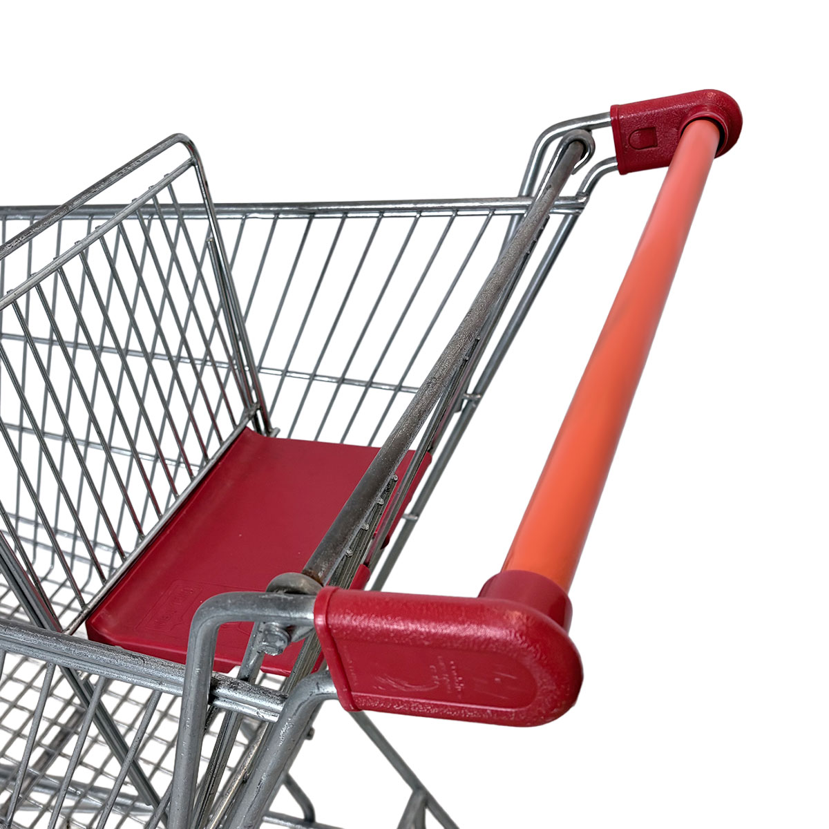 A special feature is the red child seat integrated into the front of the cart. This allows parents with small children to shop comfortably and safely while the child sits in the seat.