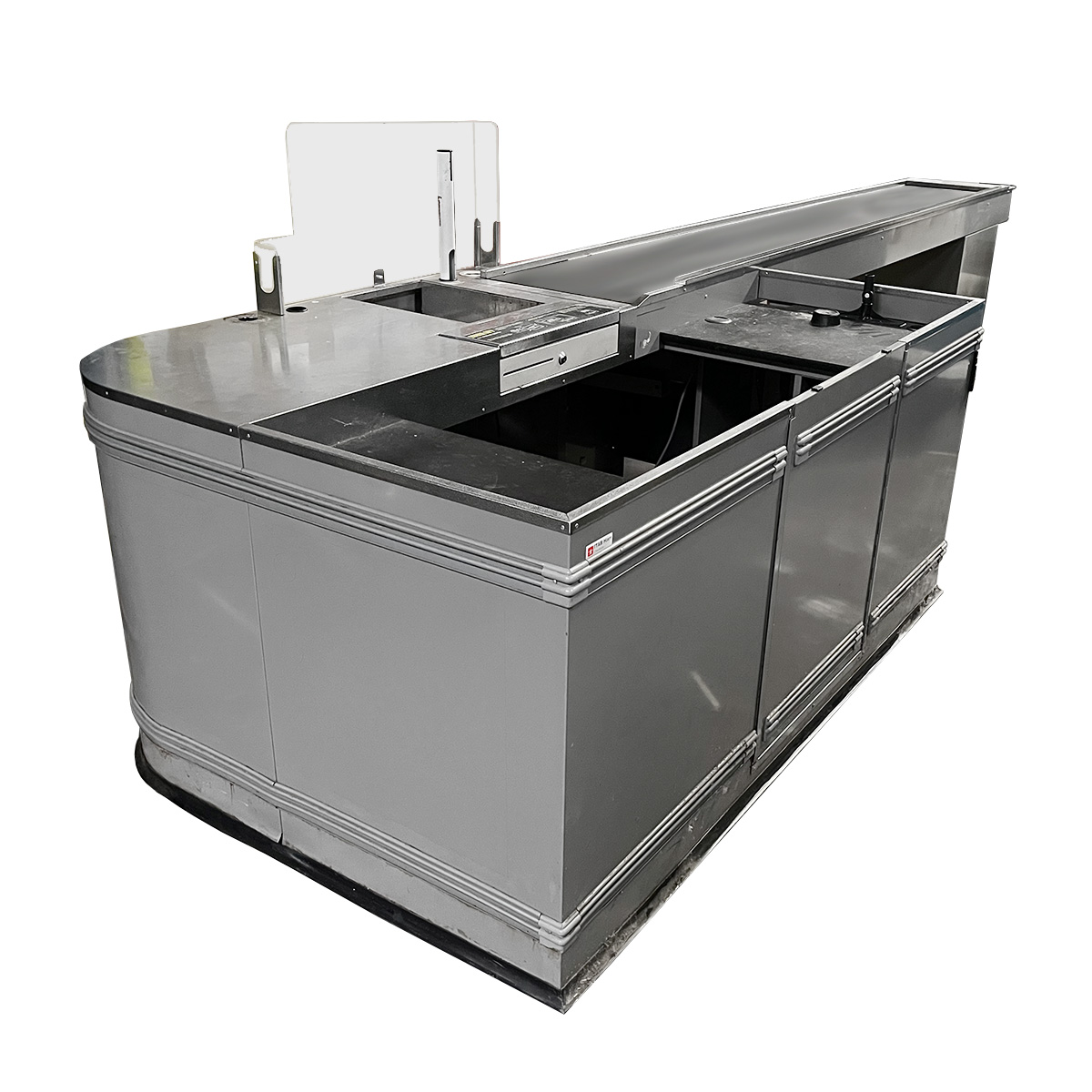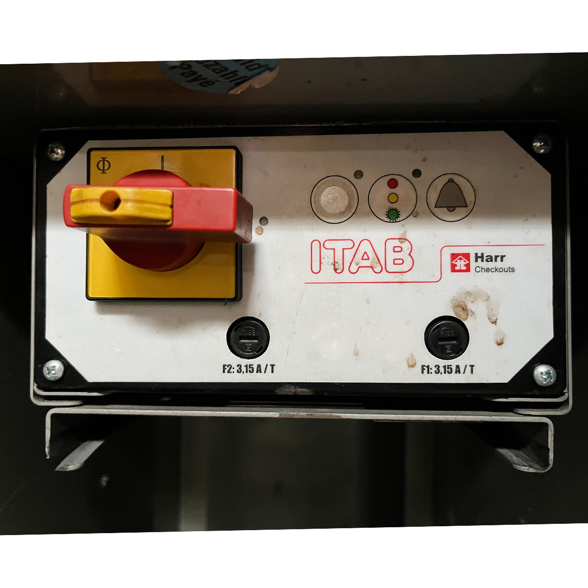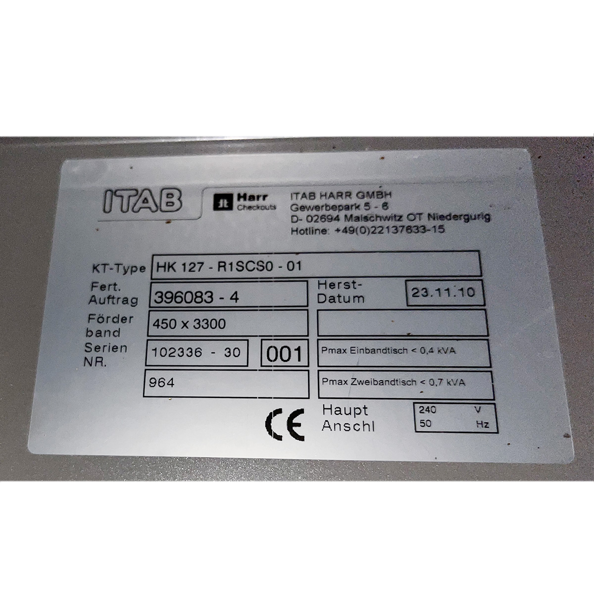 Although it is a used checkout counter, the ITAB HARR model HK 127 is in good condition. The conveyor belt is functional and the surface of the table is well maintained and shows only minimal signs of wear.