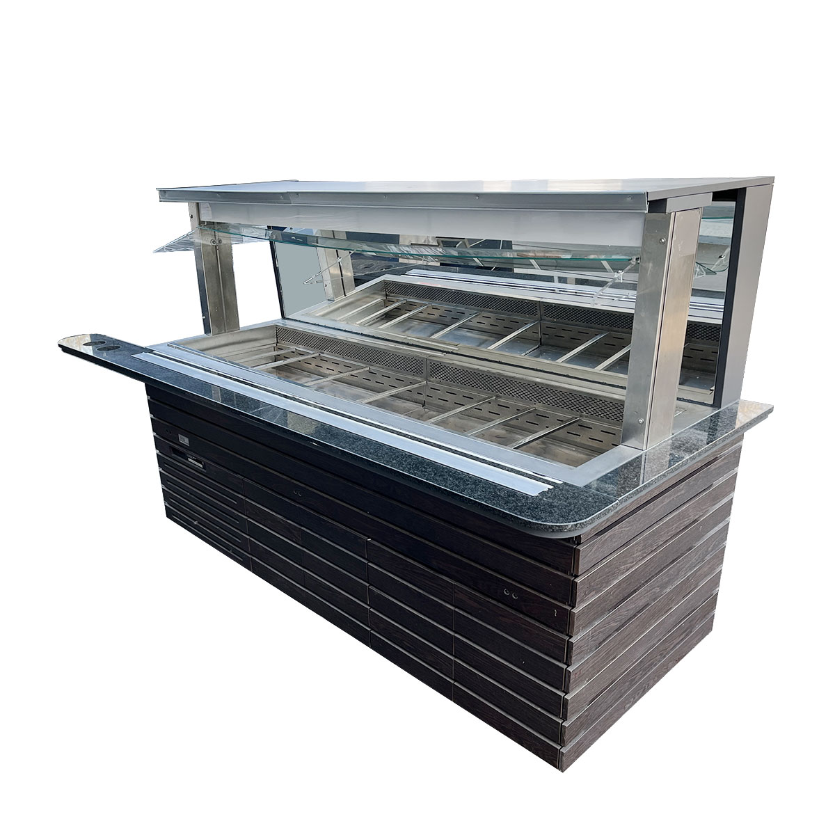 The cabinet is clad in a stylish dark wood decor that not only looks elegant but is also robust and easy to clean. The combination of natural wood look and functional stainless steel interior makes this salad bar an eye-catcher in any sales or dining area.