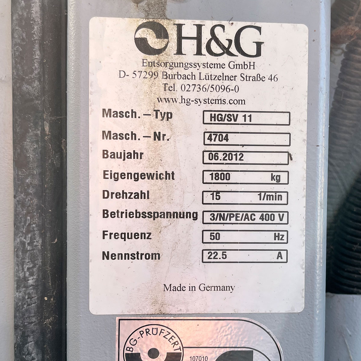 Are you looking for an efficient and reliable solution for compacting waste? We are offering a used screw compactor from the renowned manufacturer H&G, model HG/SV 11, built in 2012. This machine is characterized by its robust construction, high compaction performance, and durability.