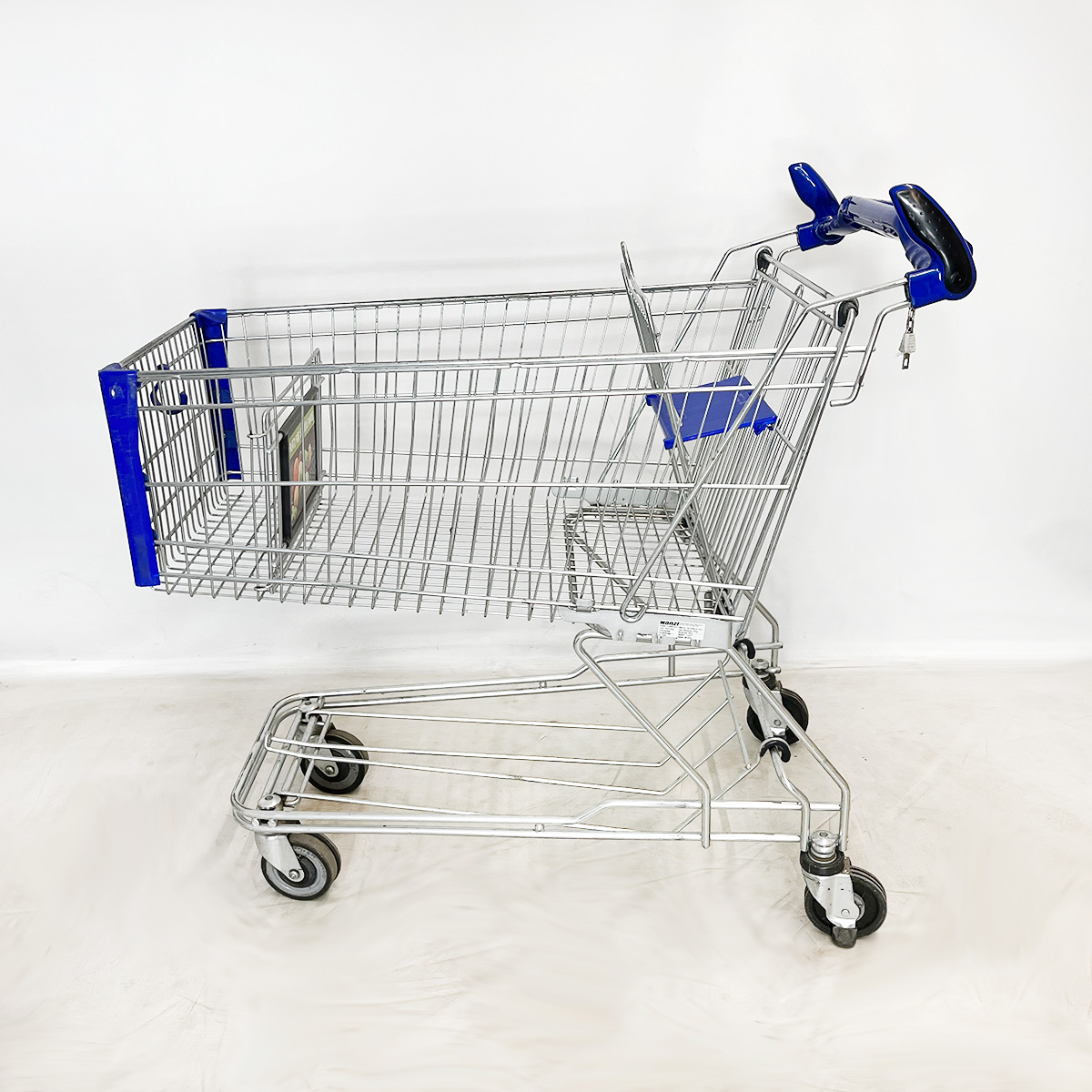 This shopping cart is made in Germany by WANZL. The trolley is equipped with a child seat and has a basket capacity of 142 liters.