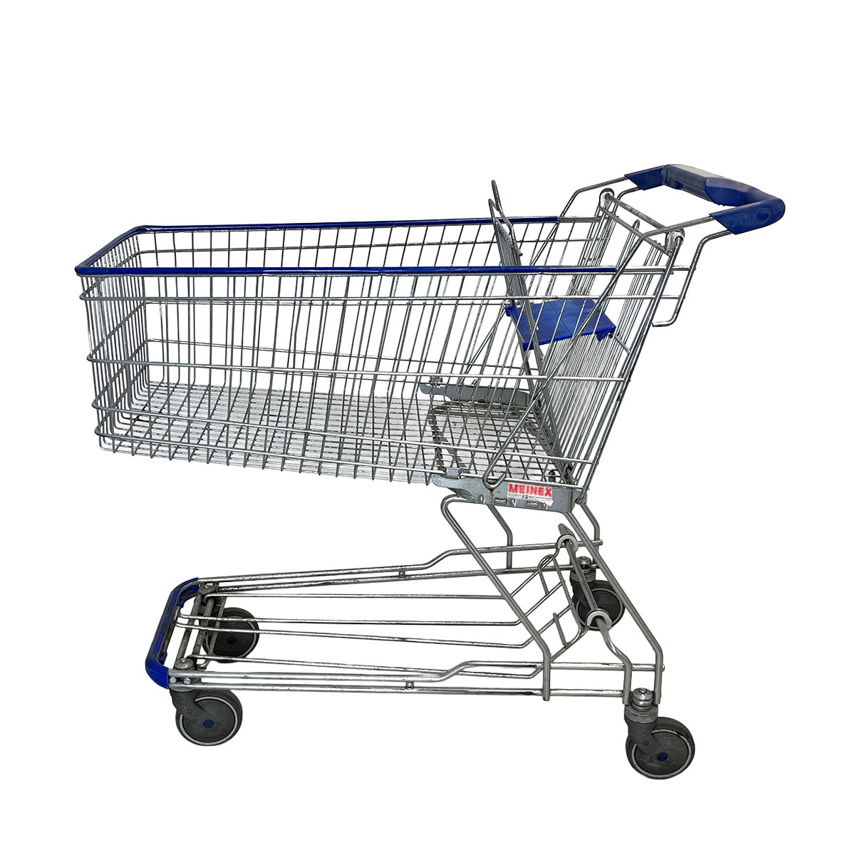 The cart is equipped with a blue child seat, making shopping easier for young families. The child seat can be easily folded up when not in use. This allows the cart to be used flexibly – with or without a child on board.