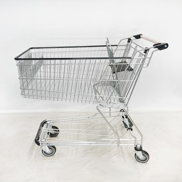 This shopping cart is made in Germany by WANZL. The trolley is equipped with a child seat and has a basket capacity of 142 liters.