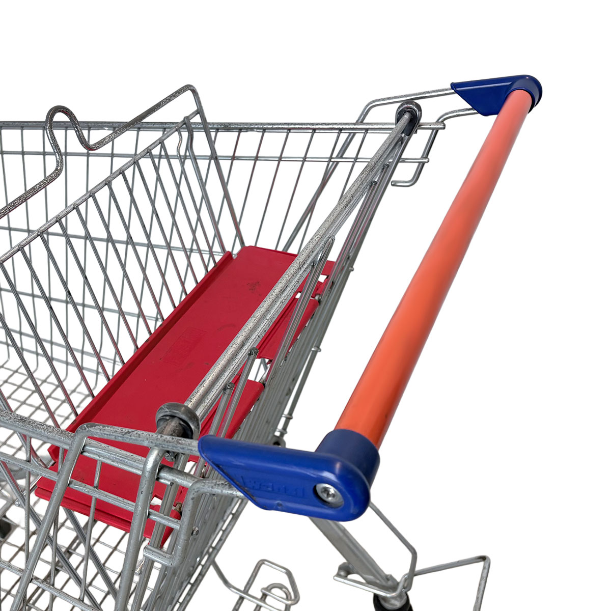 The shopping cart handle is a neutral red, with the handle ends in a striking blue – a classic, timeless design that can be integrated into any store environment. The ergonomically shaped handle ensures comfortable handling, even when the cart is fully loaded.