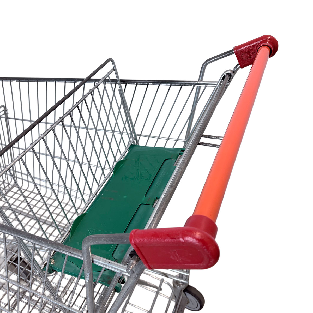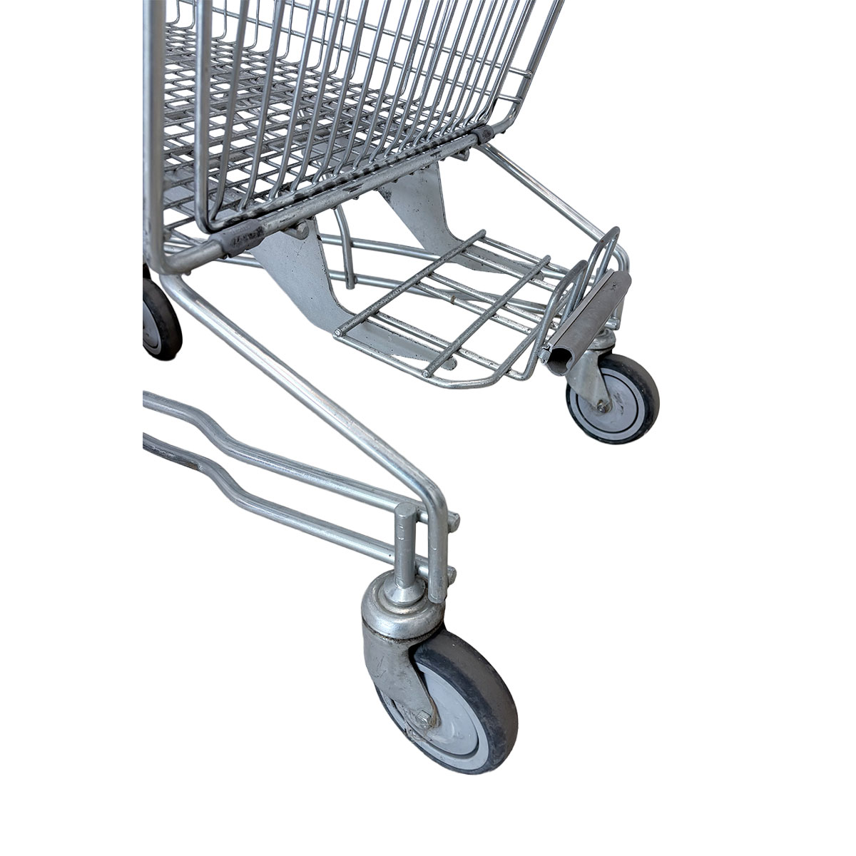 The shopping cart is used and shows normal signs of wear, such as minor scratches, abrasion on the metal, and possibly slight discoloration on the plastic.