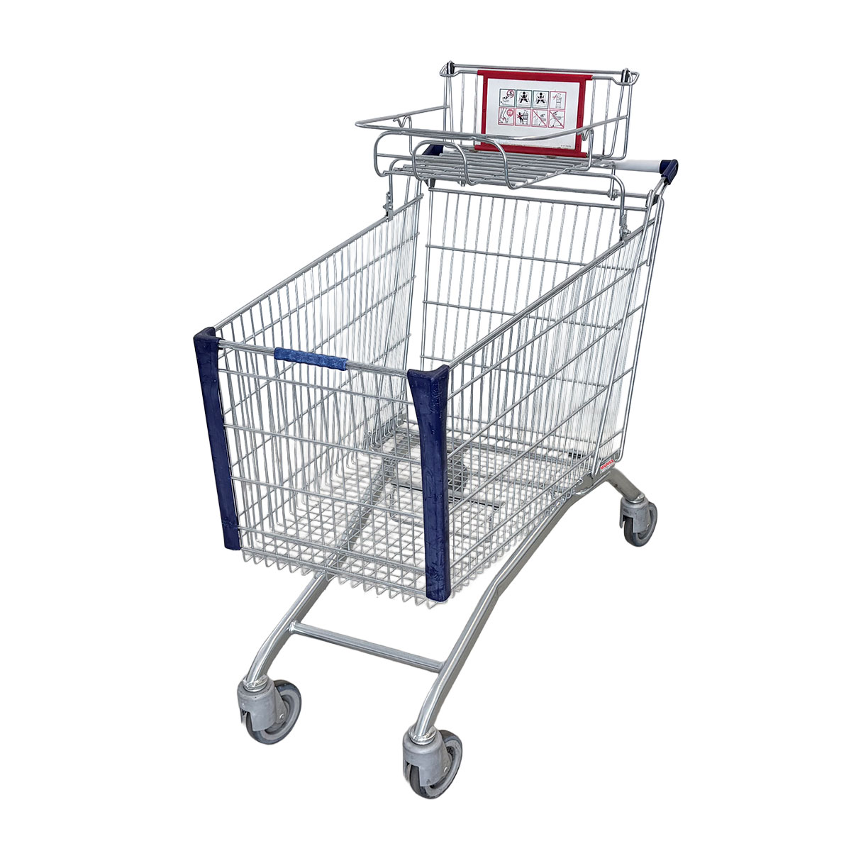 This shopping cart is made in Germany by WANZL. The trolley is equipped with a child seat and has a basket capacity of 210 liters.