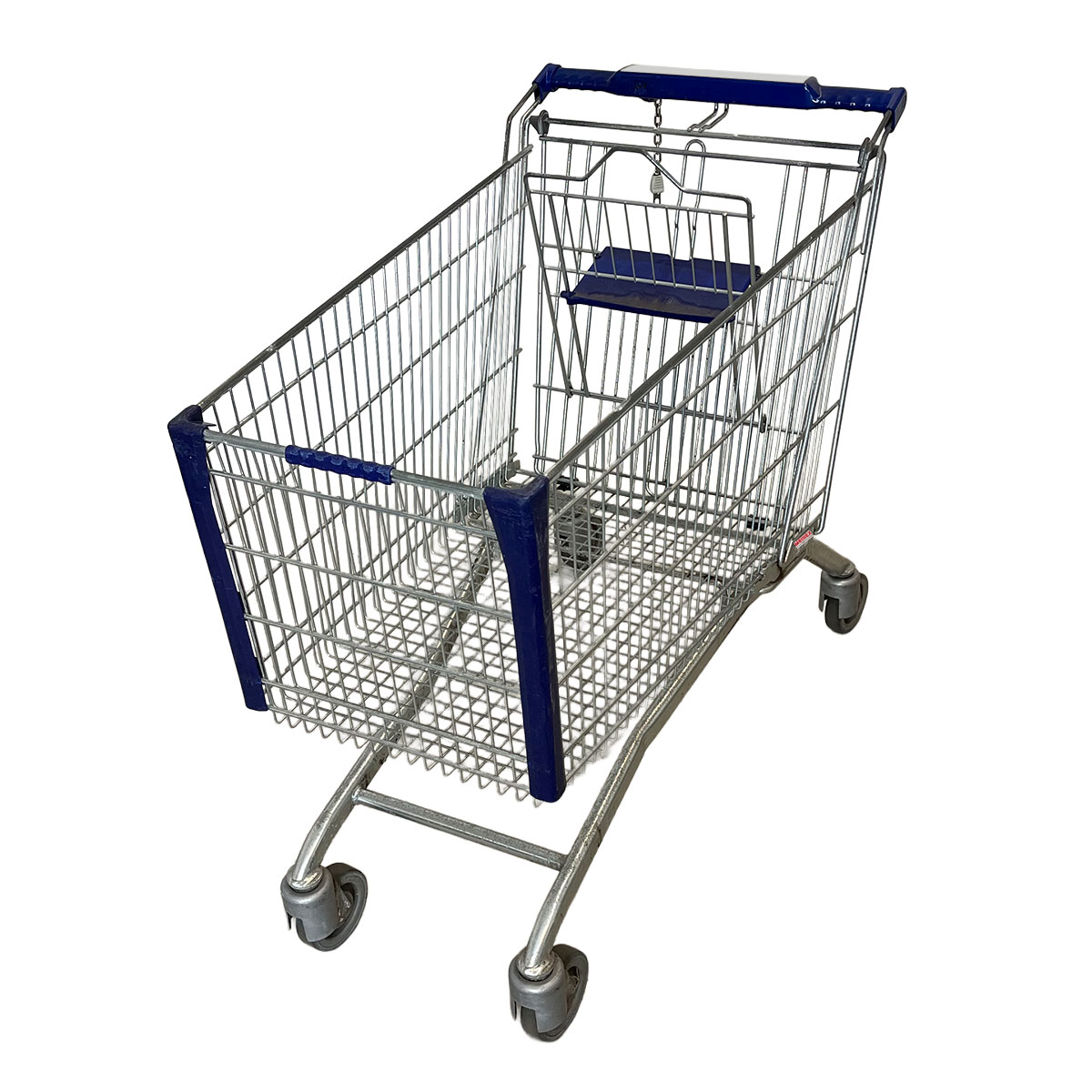 This shopping cart is made in Germany by WANZL. The trolley is equipped with a child seat and has a basket capacity of 210 liters.