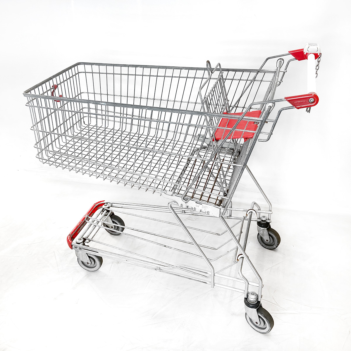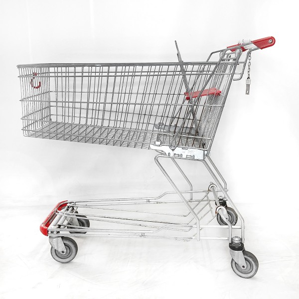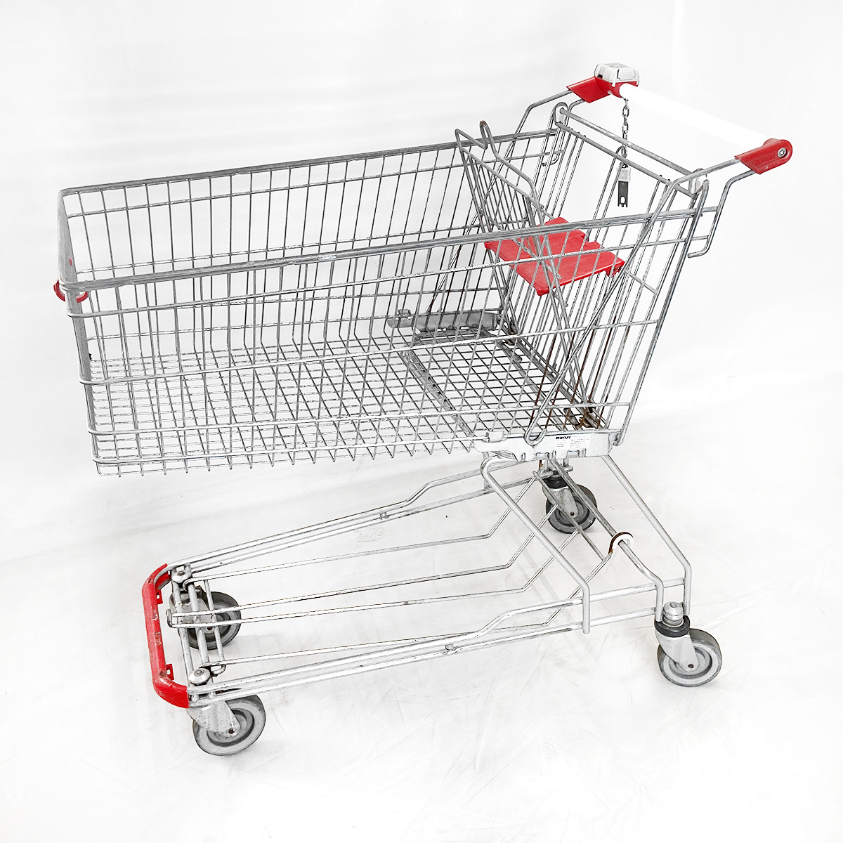 This shopping cart is made in Germany by WANZL. The trolley is equipped with a child seat and has a basket capacity of 142 liters.