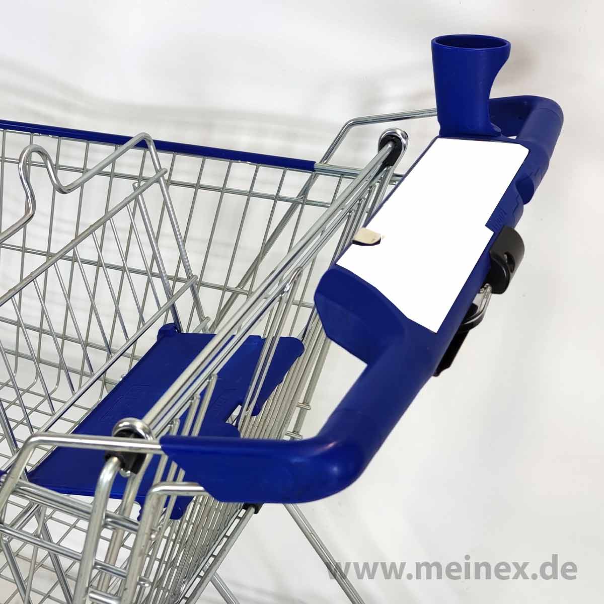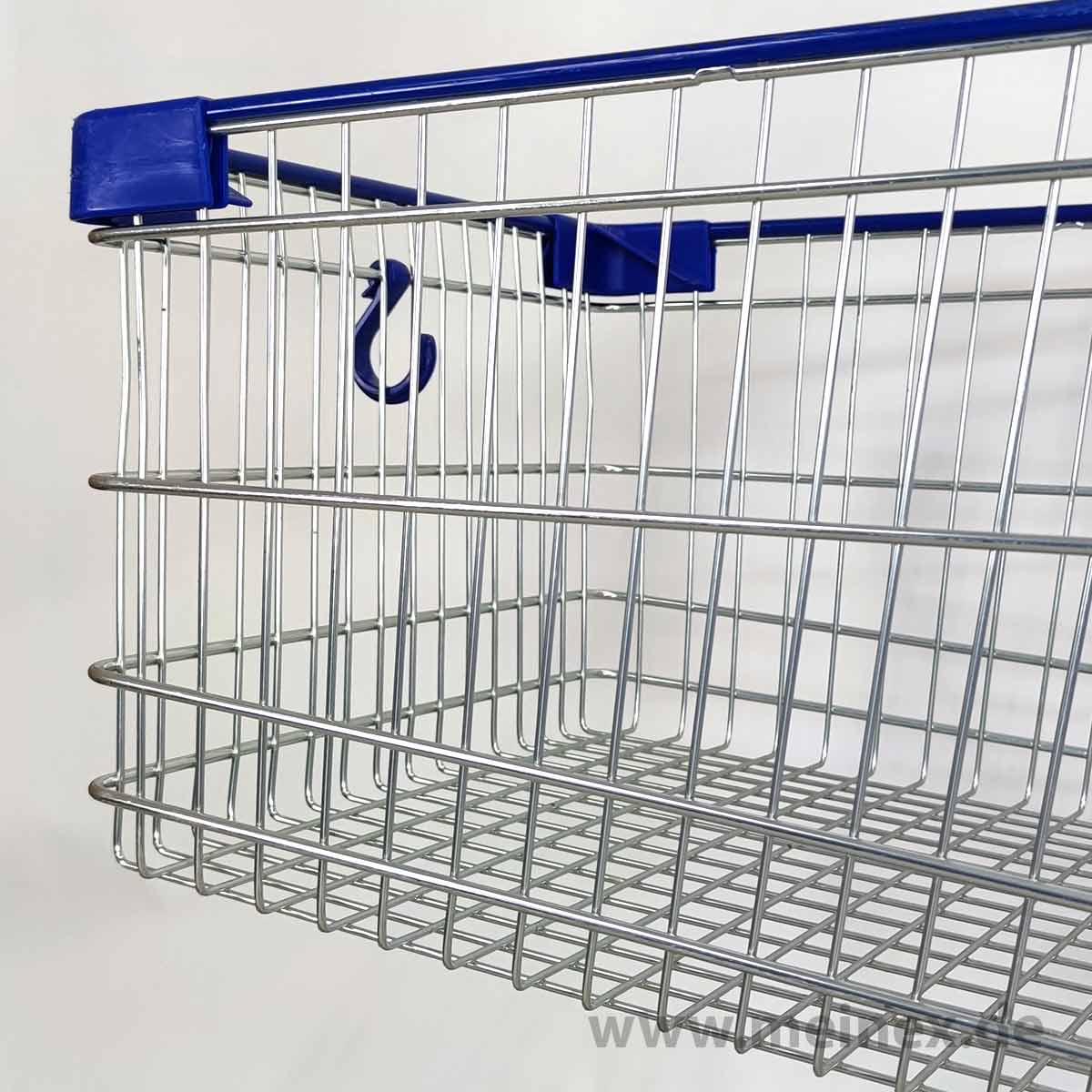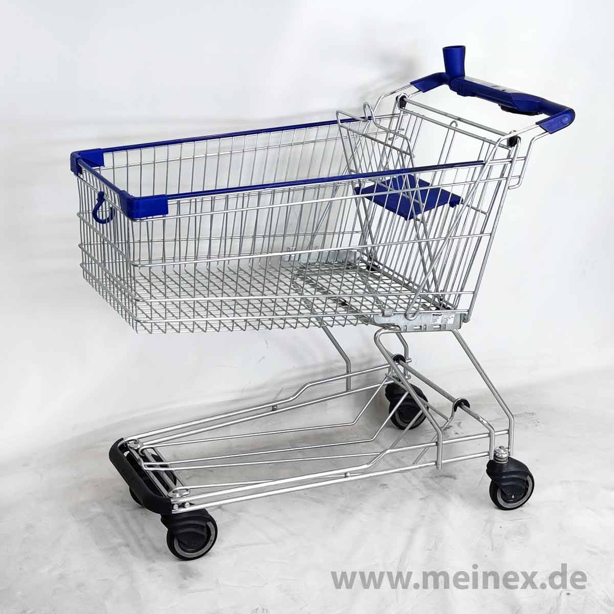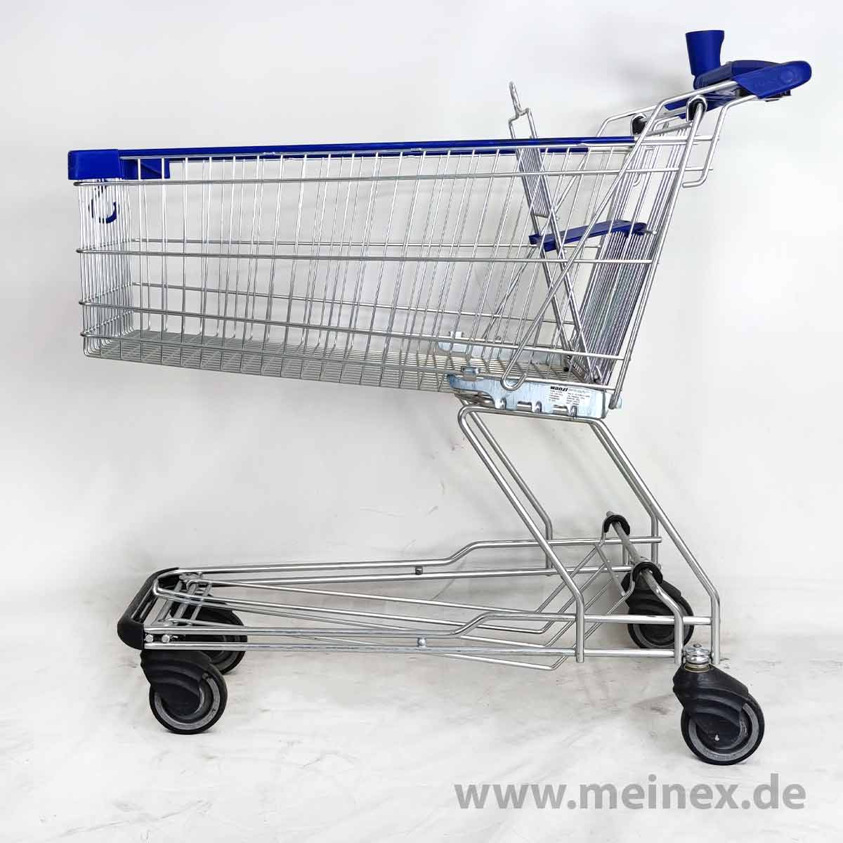 This shopping cart is made in Germany by WANZL. The trolley is equipped with a child seat and has a basket capacity of 142 liters.
