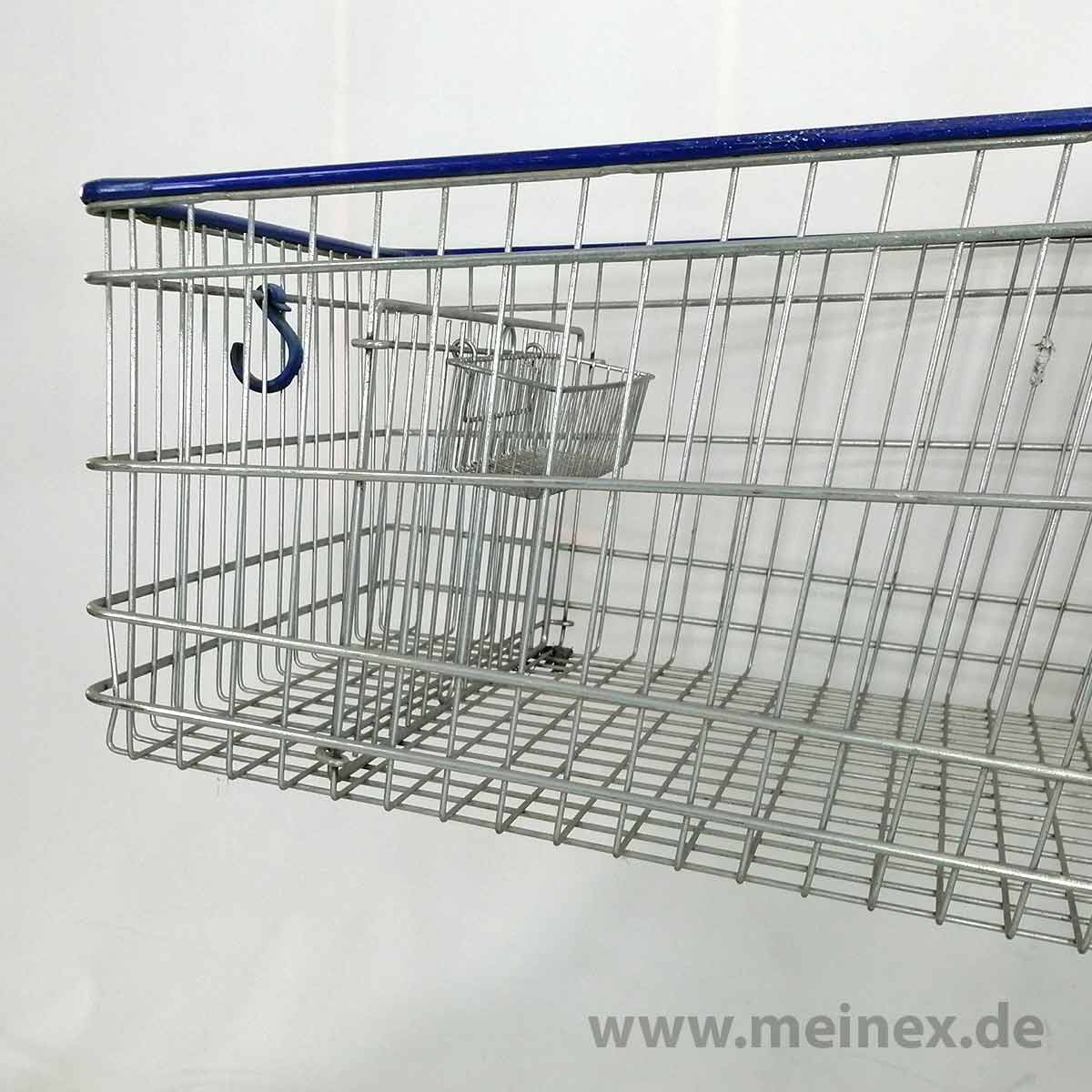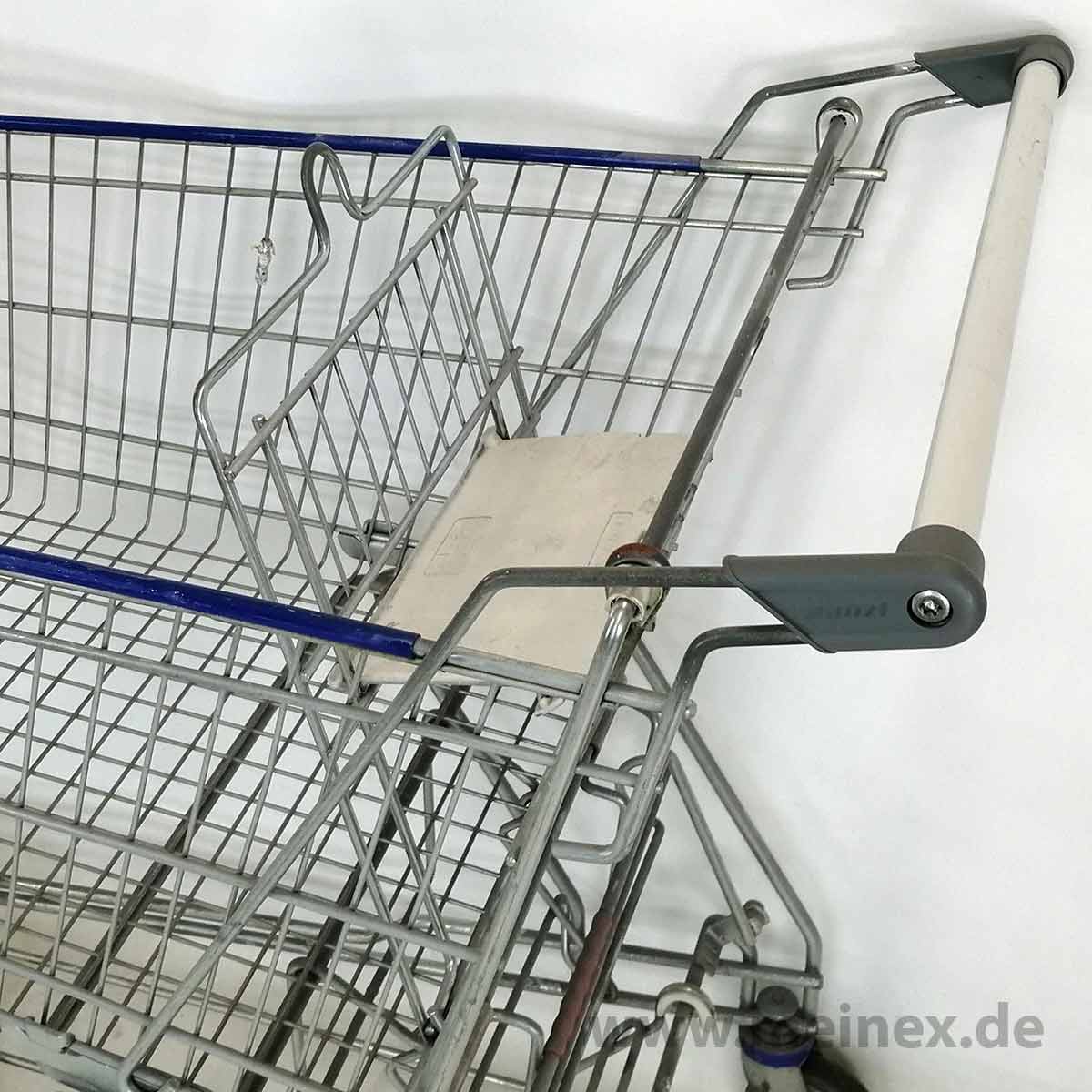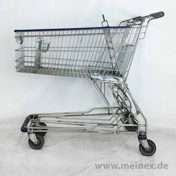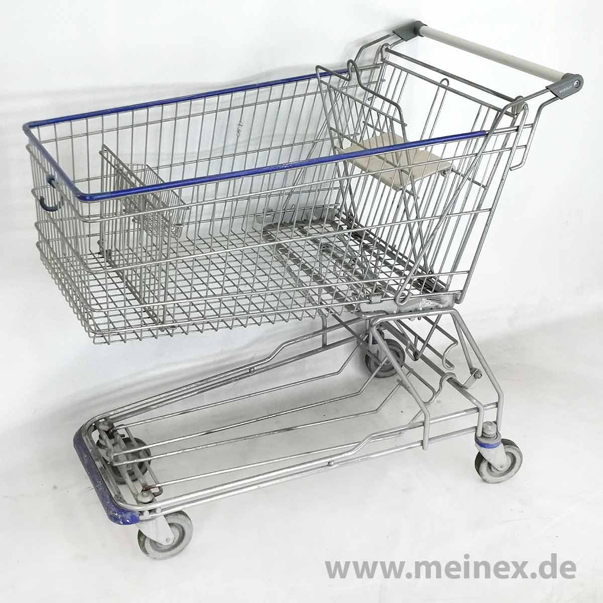 This shopping cart is made in Germany by WANZL. The trolley is equipped with a child seat and has a basket capacity of 142 liters.