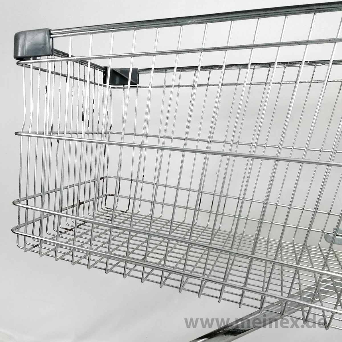Shopping carts of the ELA series are perfect for markets with wide range of drinks. Shopping trolleys of this series also meet high requirements for theft protection. There are no storage possibilities underneath the basket and with the basket size of 179 liters the ELA 185 cart fits perfectly in the assortment of medium sized companies of all industries. Beverage containers, large goods or even crates can be conveniently and safely transported on the folding shelf.