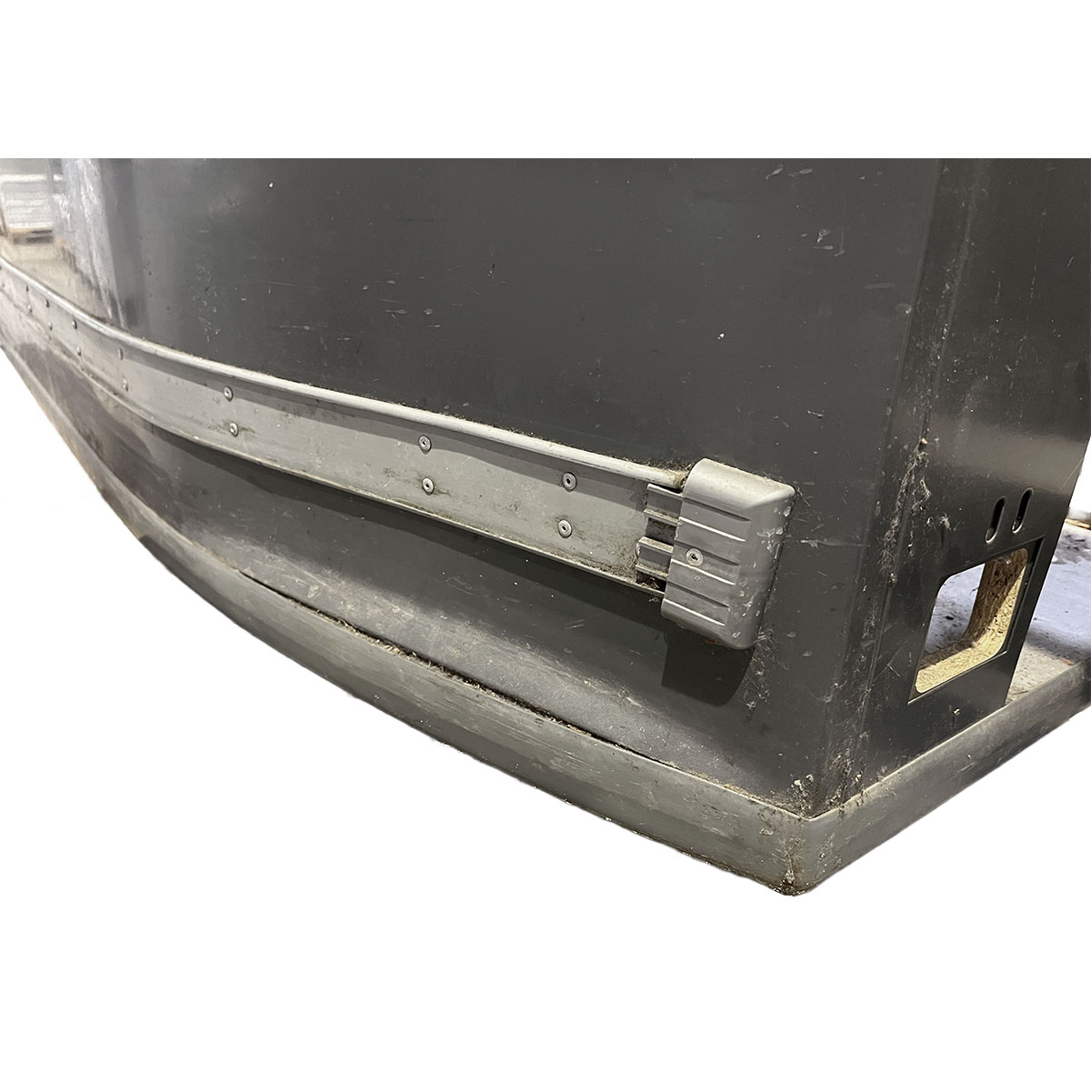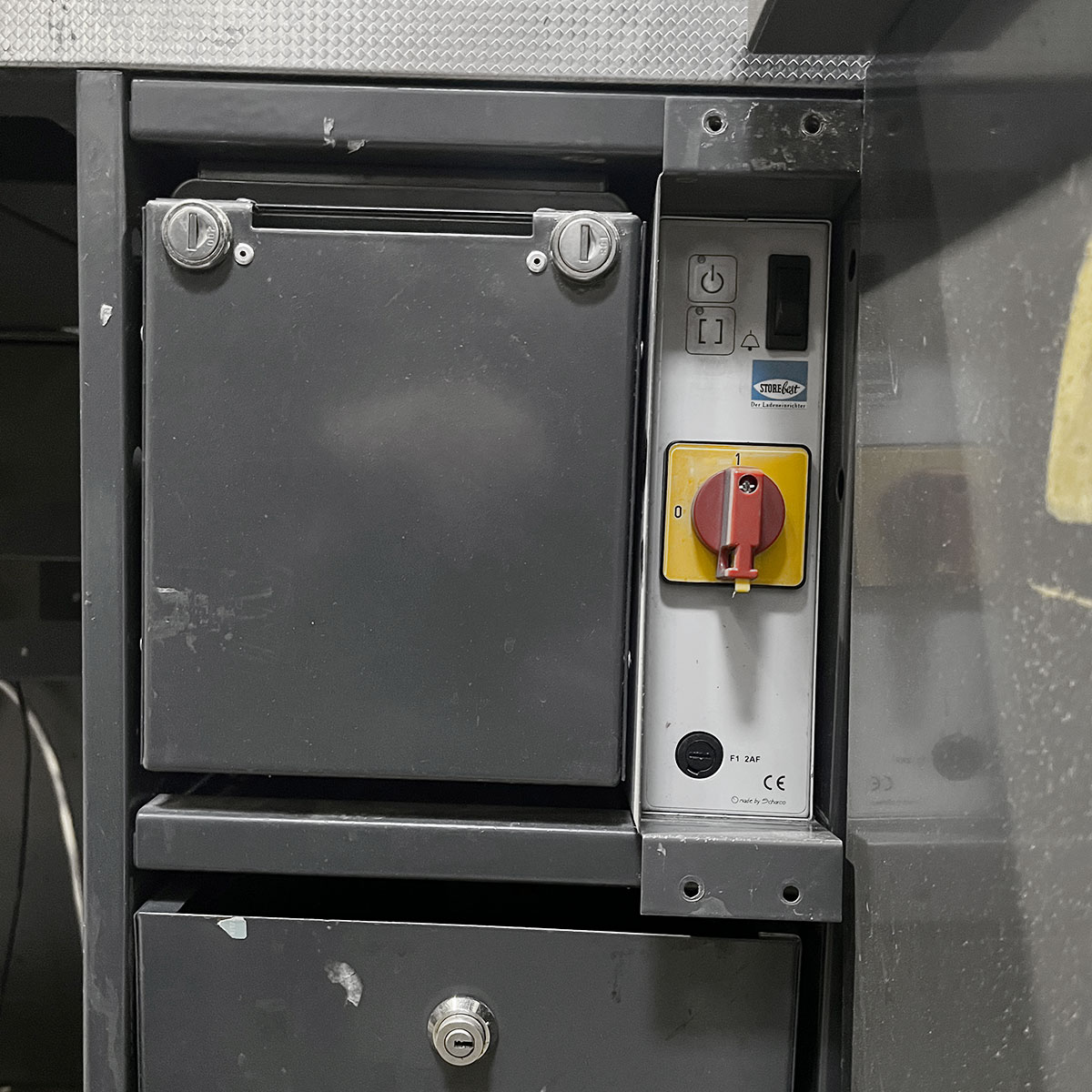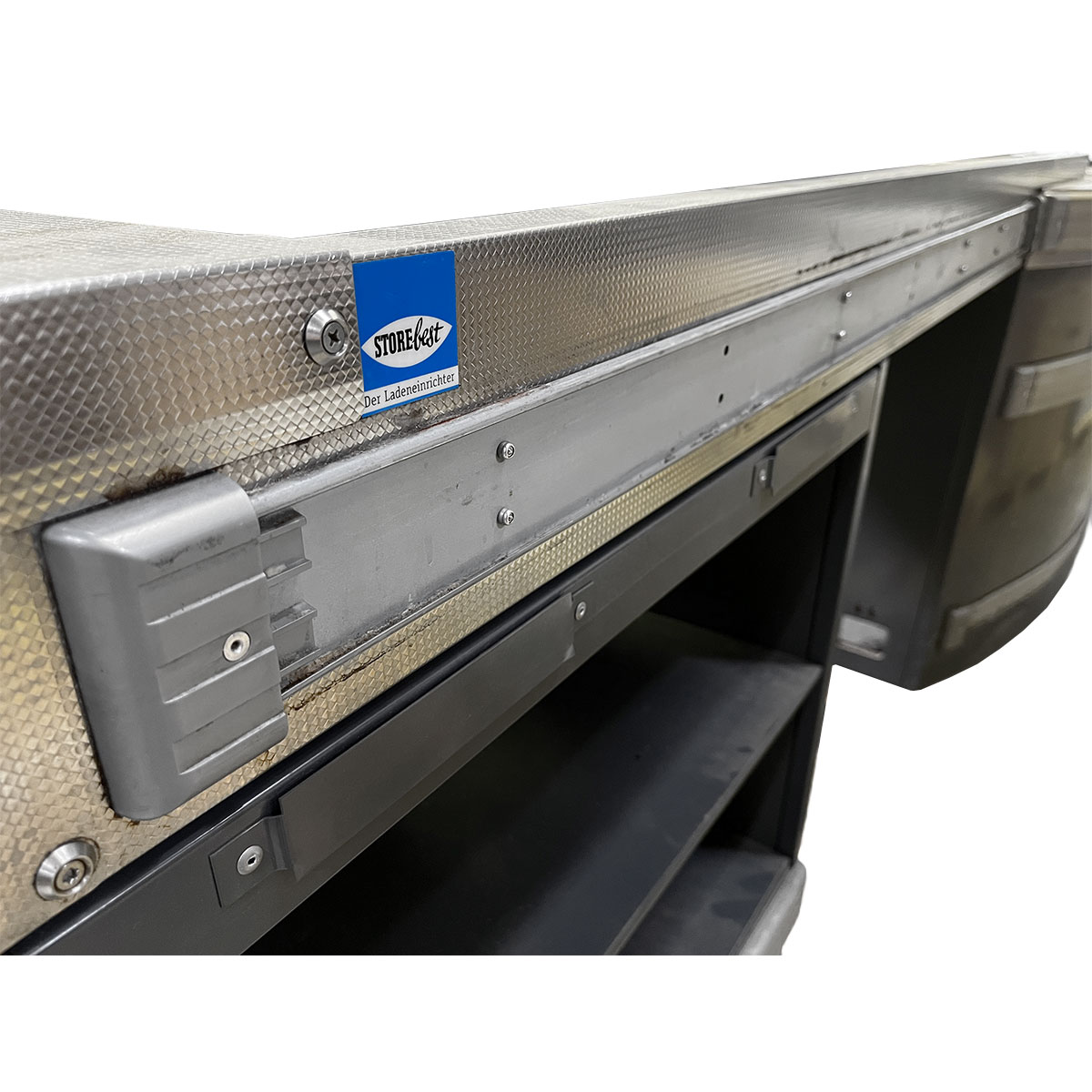 The checkout counter is used and shows visible signs of wear, including dents and missing protective strips. However, these visual defects do not affect its functionality. The checkout counter is fully operational and continues to offer high reliability in daily operation.