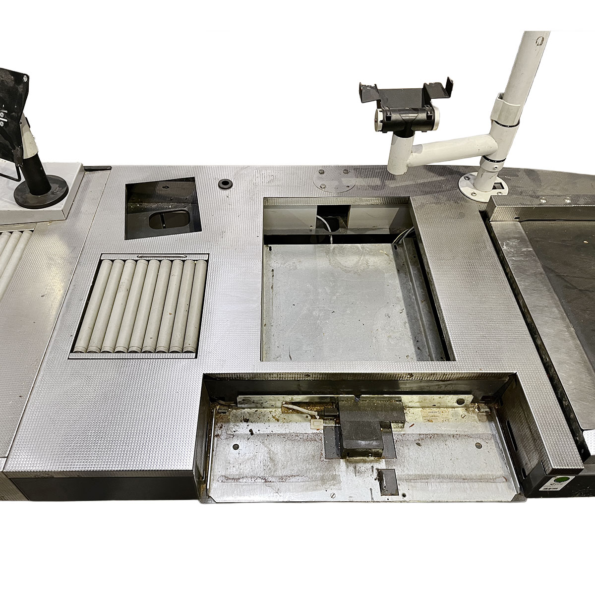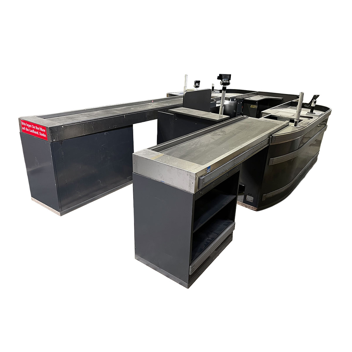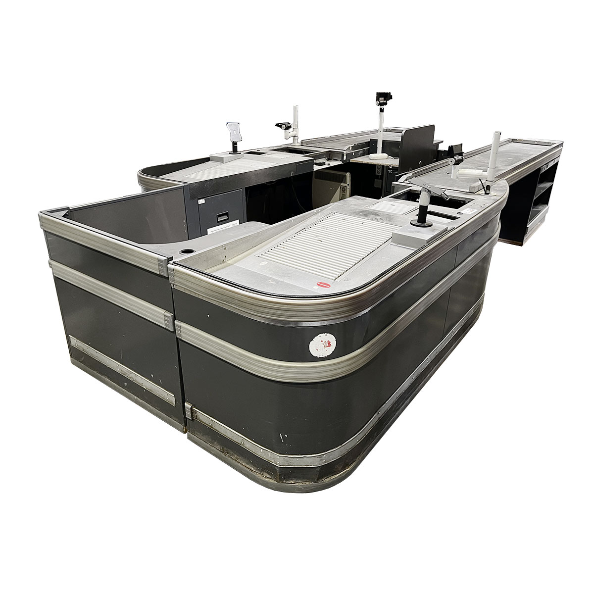 This used tandem checkout counter from Storebest, model Body TA KV ROUND, is the ideal solution for supermarkets and retail stores that value efficiency, reliability, and high throughput capacity. With its two conveyor belts and spacious merchandise trays, this checkout counter offers optimal conditions for a smooth checkout process.