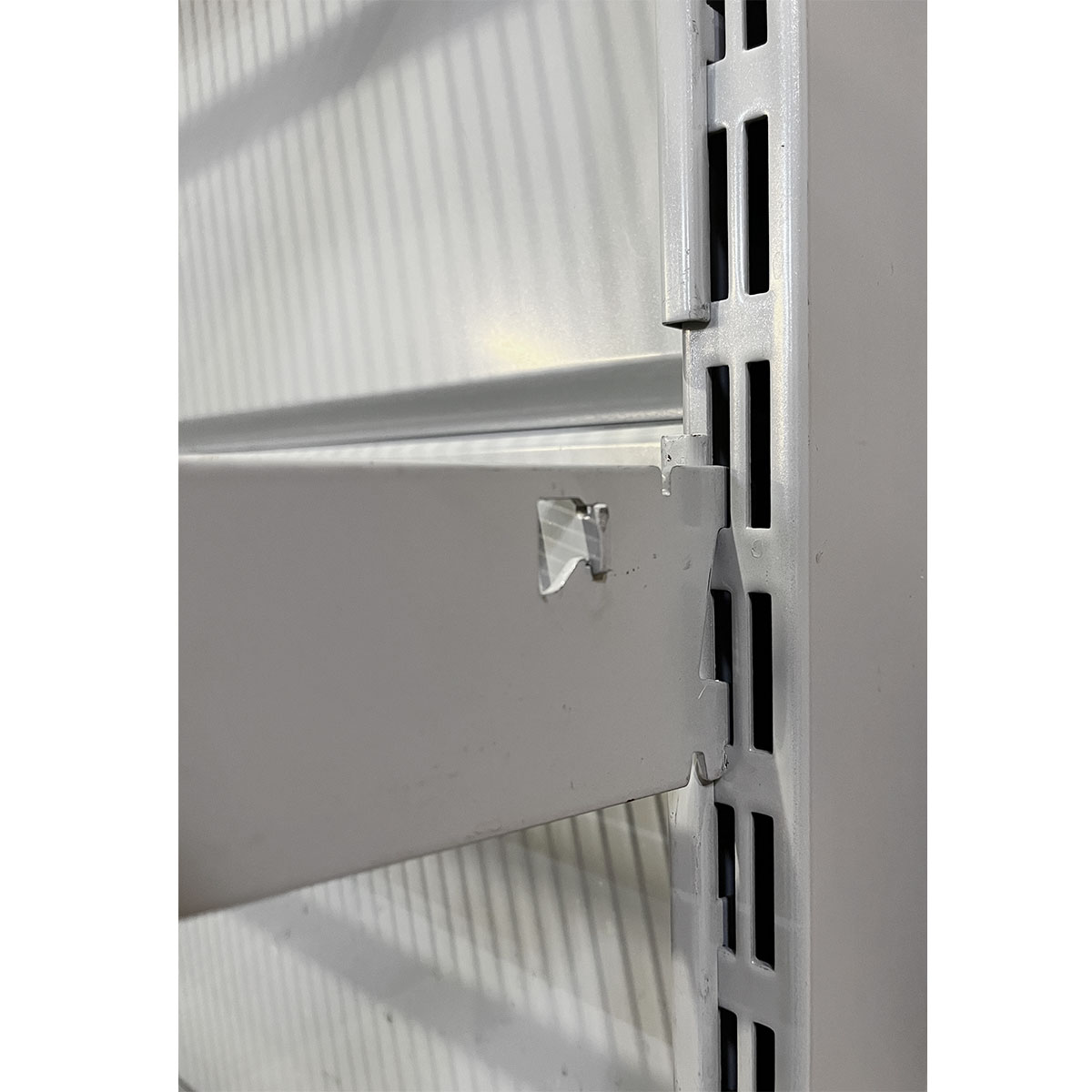 This high-quality wall shelf from Storebest impresses with its stability, functionality, and modern design in white aluminum. The shelf consists of 10 individual wall shelves, each 1,000 mm wide, which can be connected to create an impressive total width of 10 meters – ideal for use in retail, warehouses, or salesrooms.