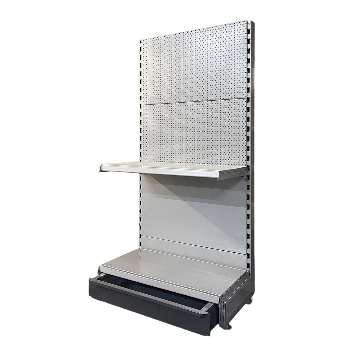With this Tegometall wall shelf in white aluminum, you get a robust, versatile, and space-saving shelving system for professional use in retail. Thanks to the combination of a smooth and perforated back panel, an adjustable shelf, and a practical foot drawer, it is the ideal solution for flexible product presentation.