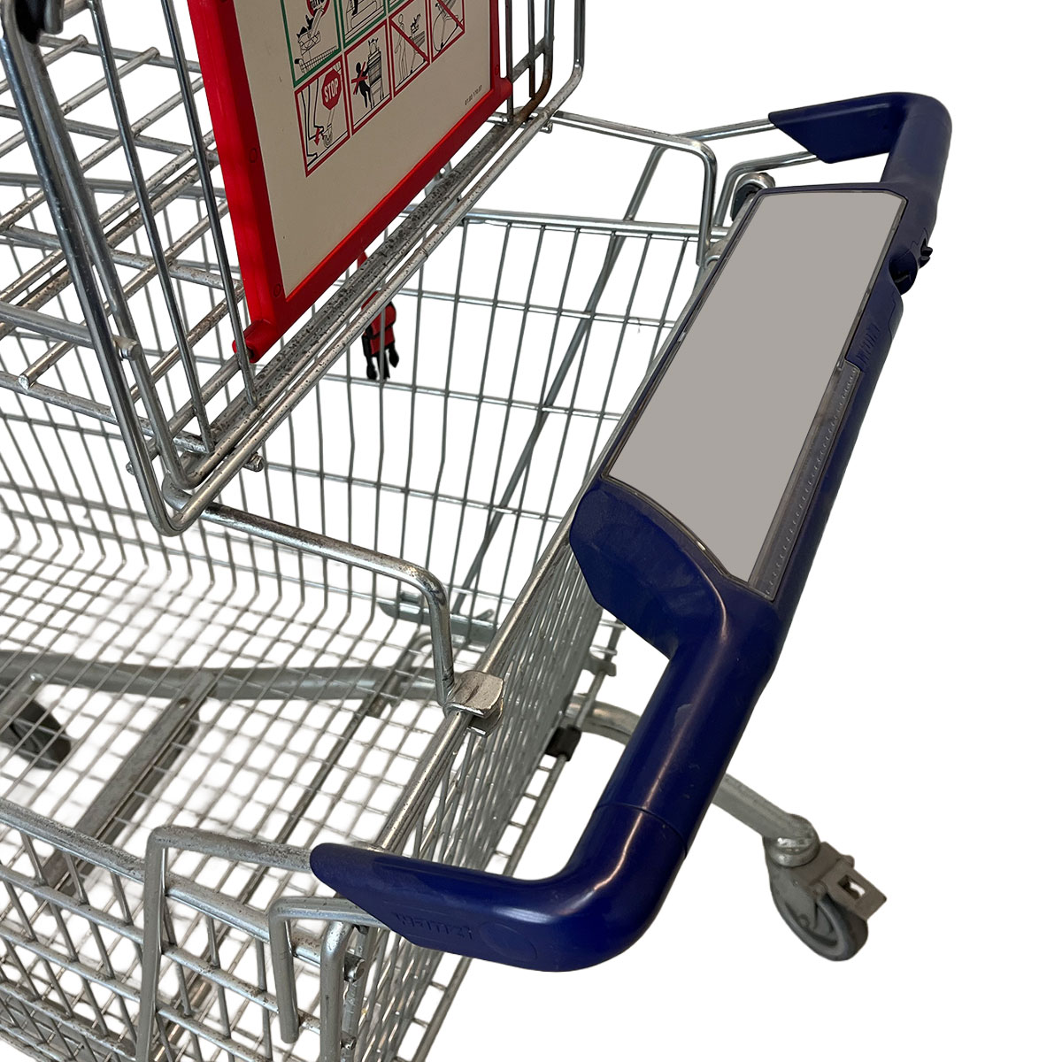This shopping cart is made in Germany by WANZL. The trolley is equipped with a child seat and has a basket capacity of 210 liters.