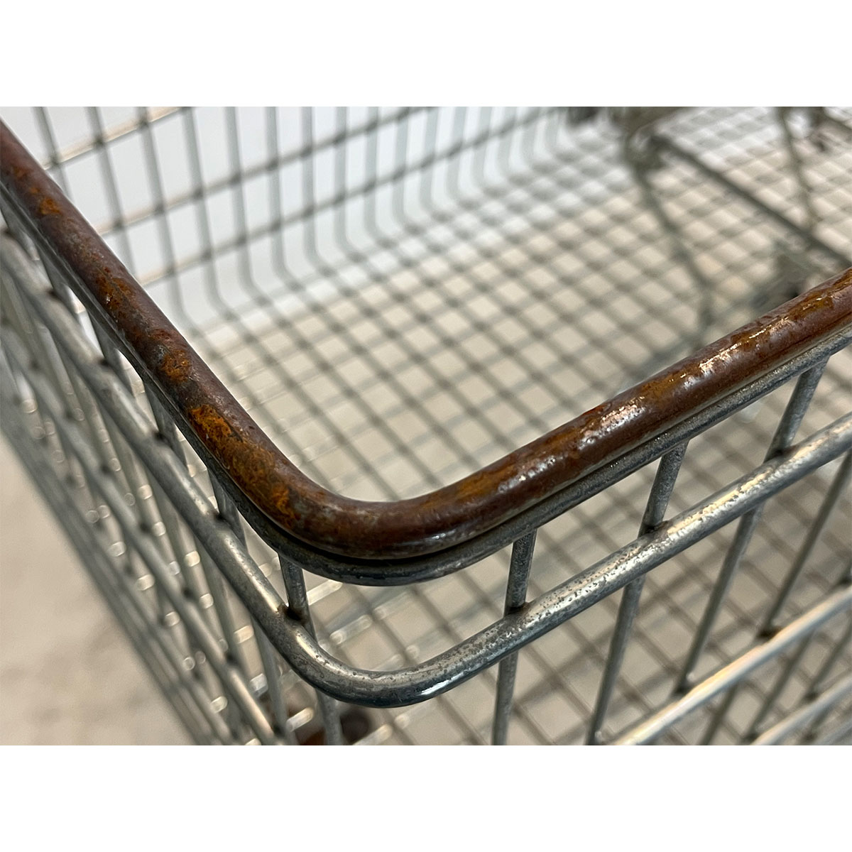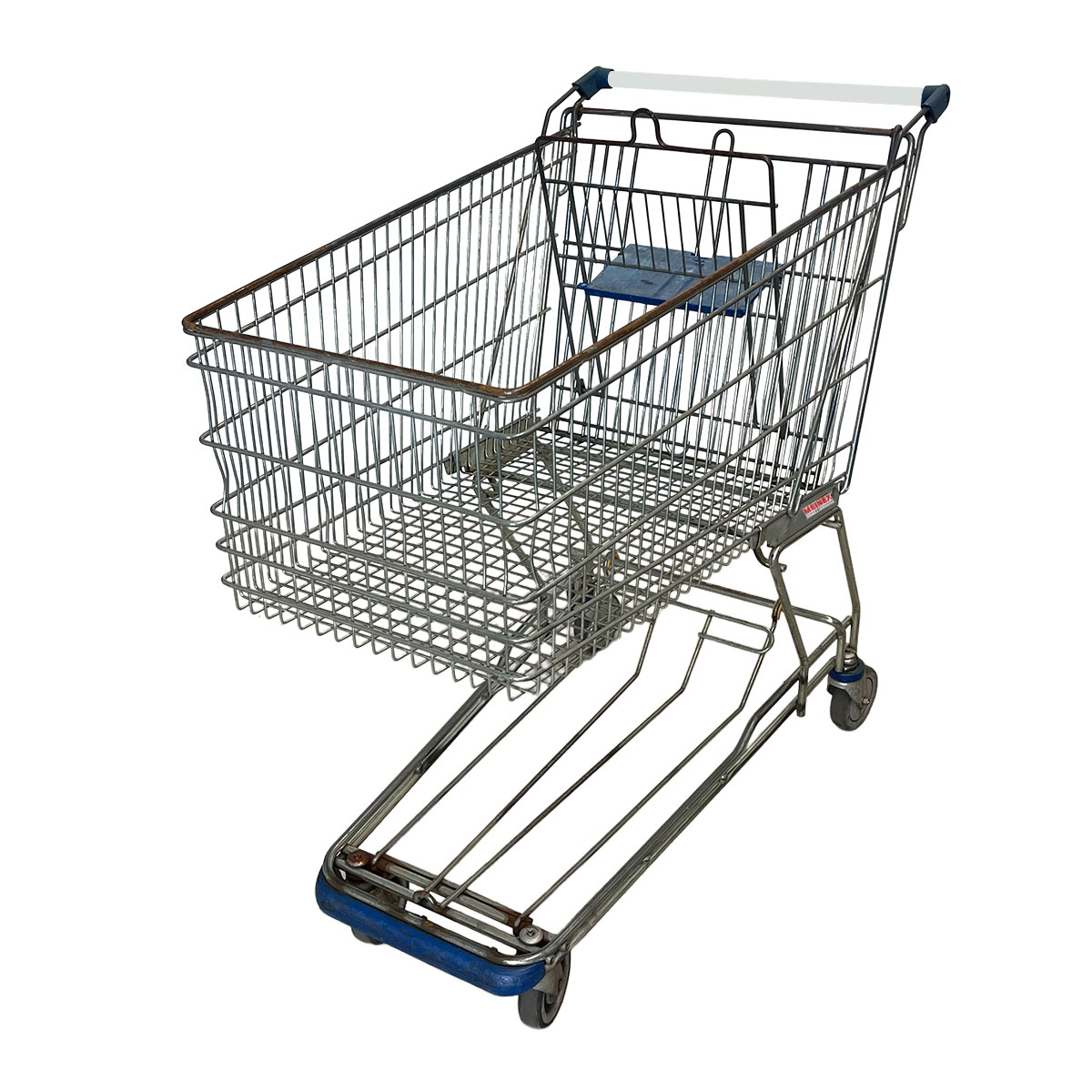 The shopping cart is used. Some rust spots are visible on the basket and the frame. Sample images are available and show the typical condition of this batch. Despite some cosmetic wear, the shopping cart is fully functional and still usable.