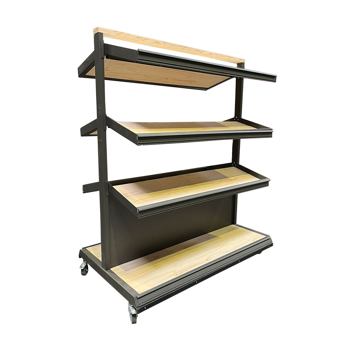 Ein besonderes Highlight dieses Gondelregals ist seine Mobilität: Es ist mit stabilen Industrie-Rollen ausgestattet, die einen einfachen Standortwechsel ermöglichen – sei es zur Umgestaltung des Ladenlayouts, zur Reinigung oder für saisonale Aktionsflächen. Die integrierten Feststellbremsen sorgen dafür, dass das Regal sicher an seinem Platz bleibt, sobald es positioniert ist.