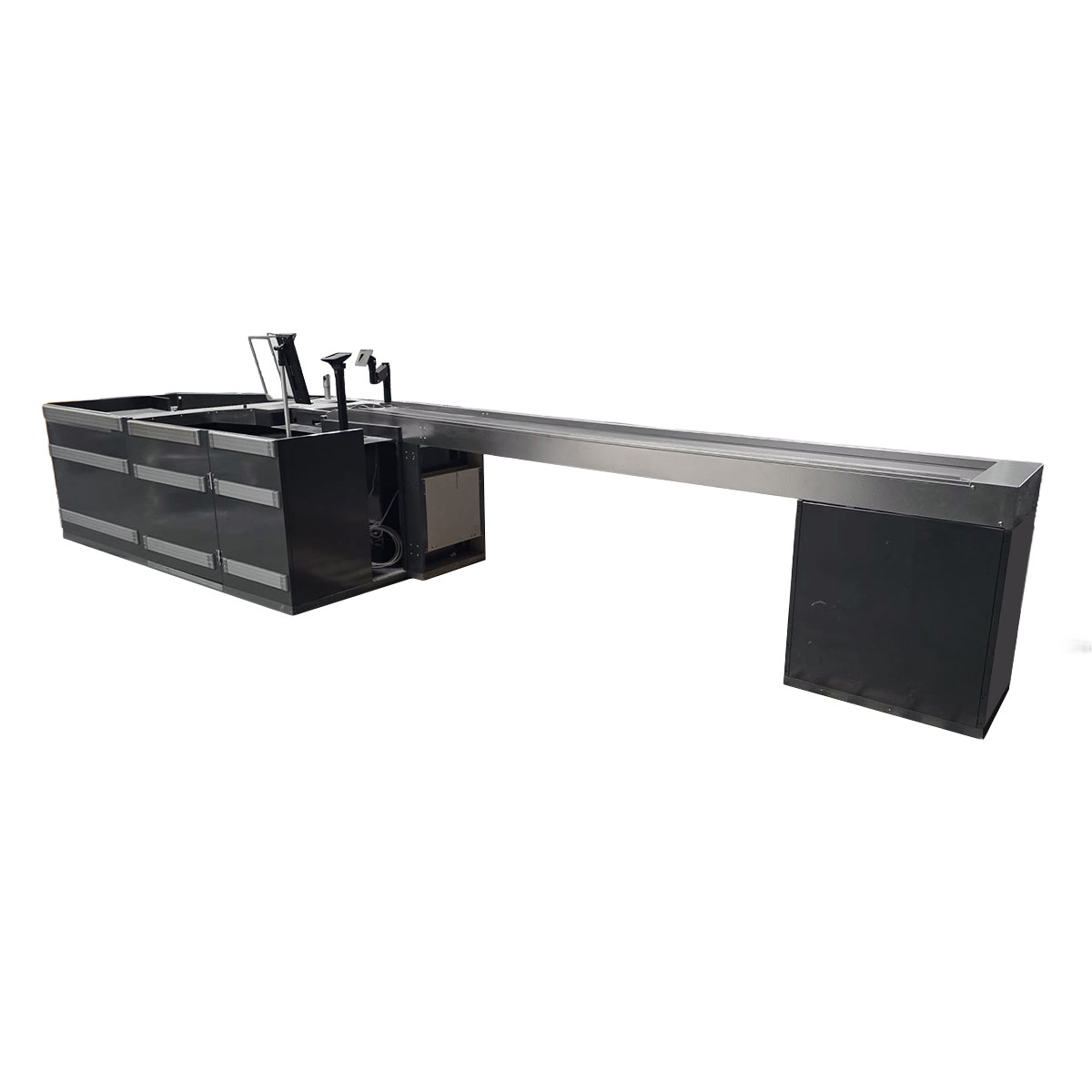 - Linksläufiger Aufbau: Der Warentransport erfolgt von links nach rechts, was den Kassierprozess für linksseitig organisierte Kassenbereiche optimiert.