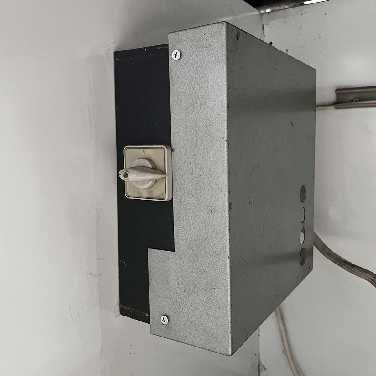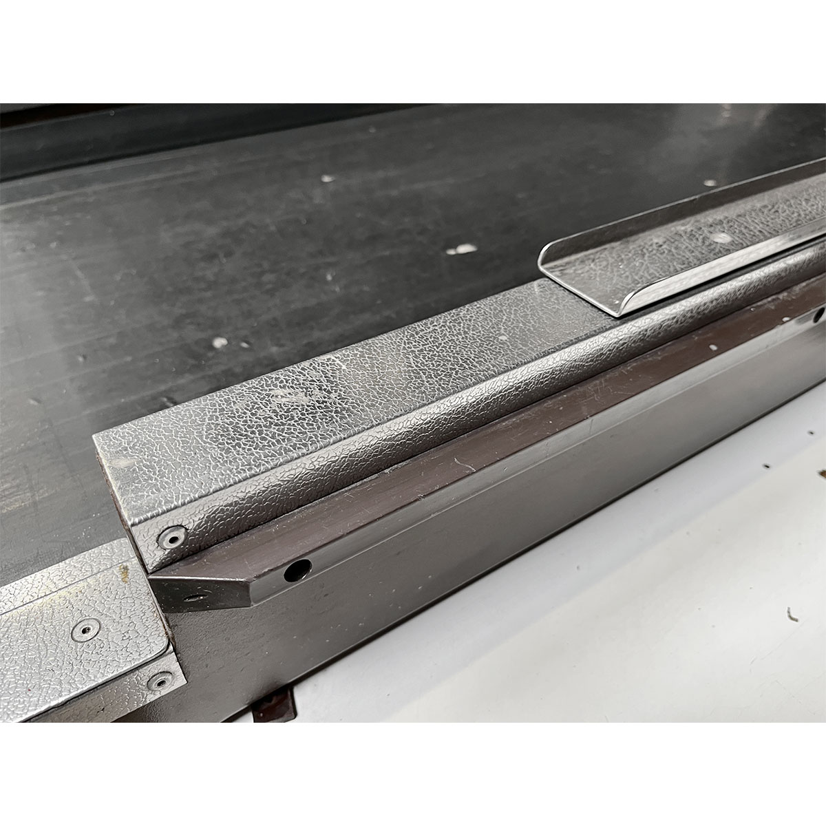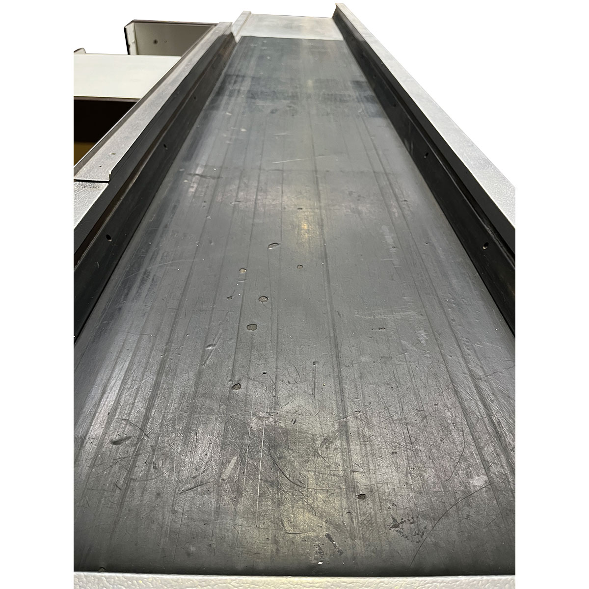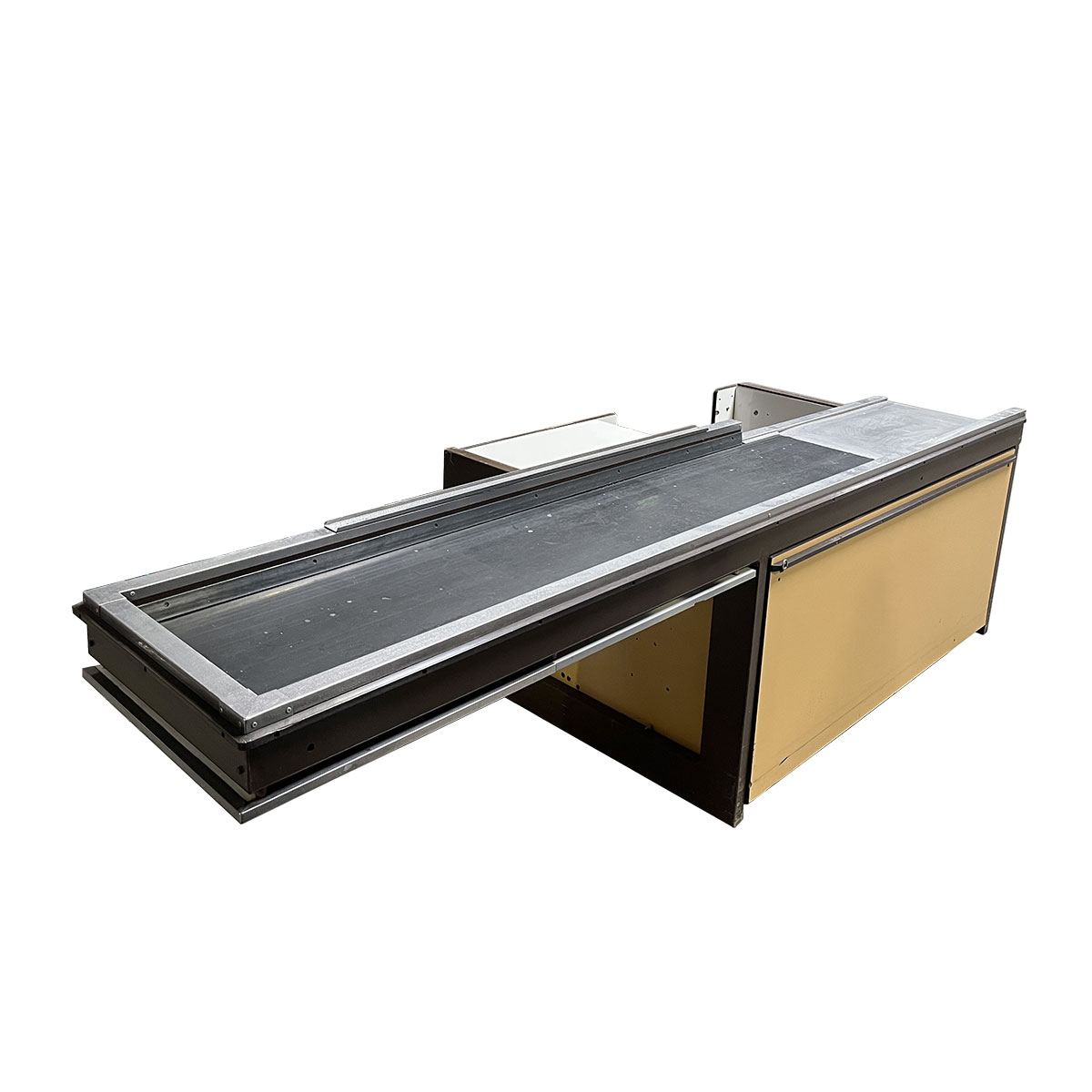 Der Kassentisch ist mit einem motorbetriebenen Warentransportband ausgestattet, das über einen 400 Volt Starkstromanschluss betrieben wird. Das Band selbst läuft technisch einwandfrei und transportiert Waren zuverlässig zur Kasse. Das Gummi des Laufbands weist jedoch Gebrauchsspuren auf, in Form mehrerer kleiner Löcher. Diese beeinträchtigen die Funktion zwar derzeit nicht wesentlich, sollte aber bei längerfristiger Nutzung eventuell ausgetauscht werden.