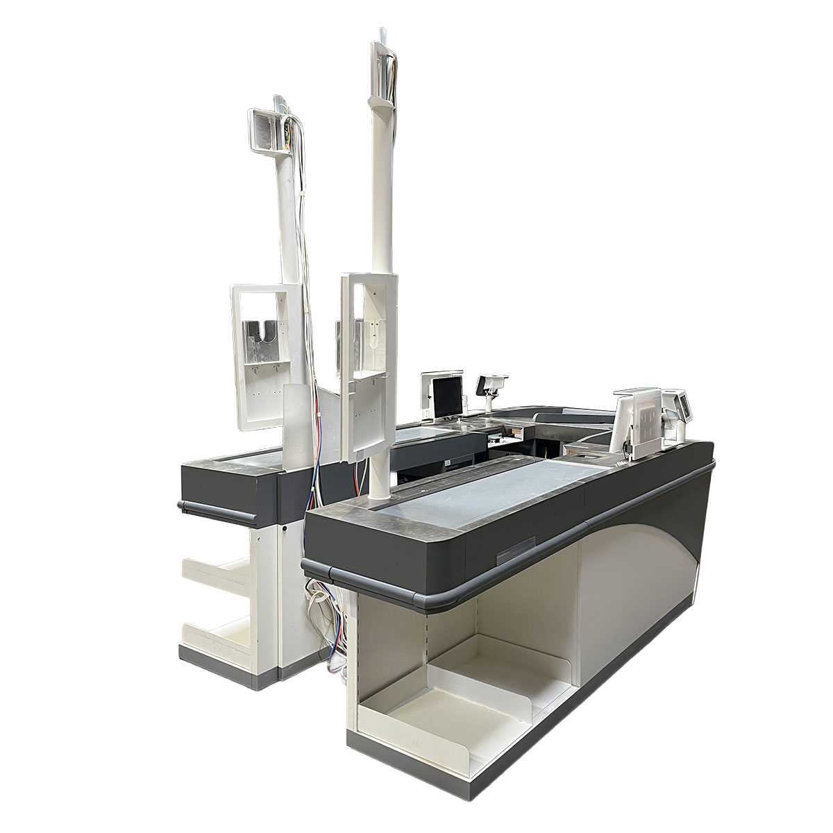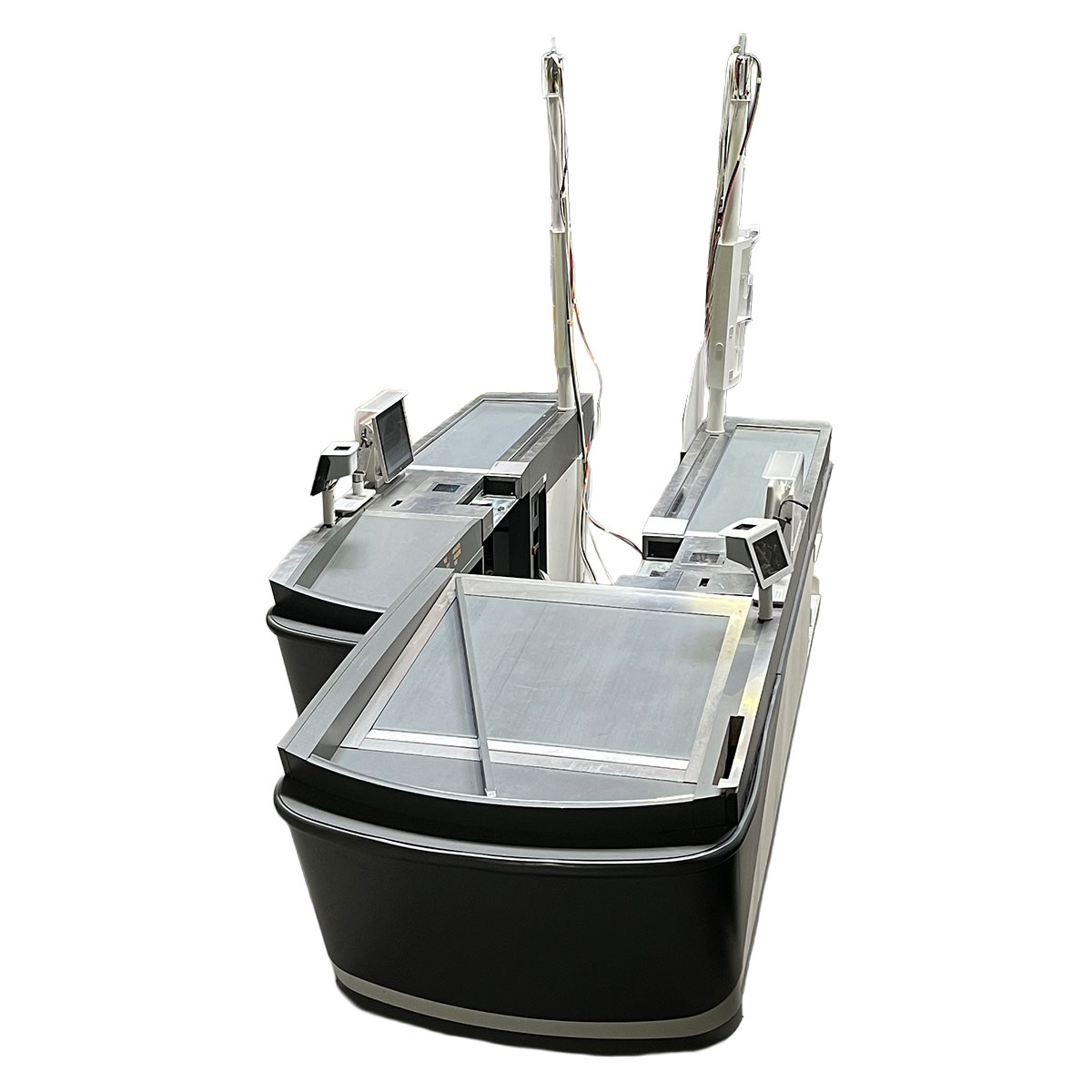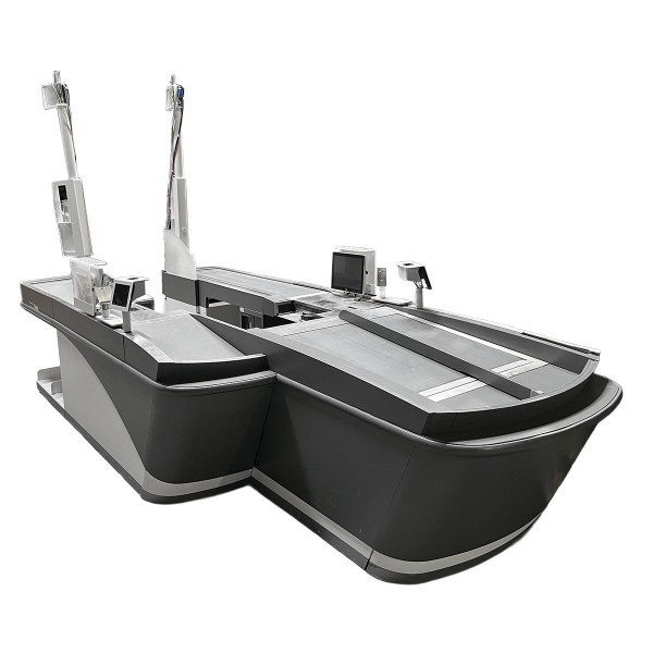 Diese Tandem-Kassenanlage ist mit zwei Laufbändern ausgestattet – ideal zur gleichzeitigen Abfertigung von zwei Kundenströmen. Die beiden Laufbänder unterscheiden sich leicht in der Länge (1.700 mm und 1.320 mm) und sind so aufgestellt, dass ein effizienter Warenfluss gewährleistet ist. Beide Kassenseiten verfügen über großzügige Warenausgabe- und Ablageflächen, sodass die Kunden ihre Einkäufe bequem ein- oder auspacken können.