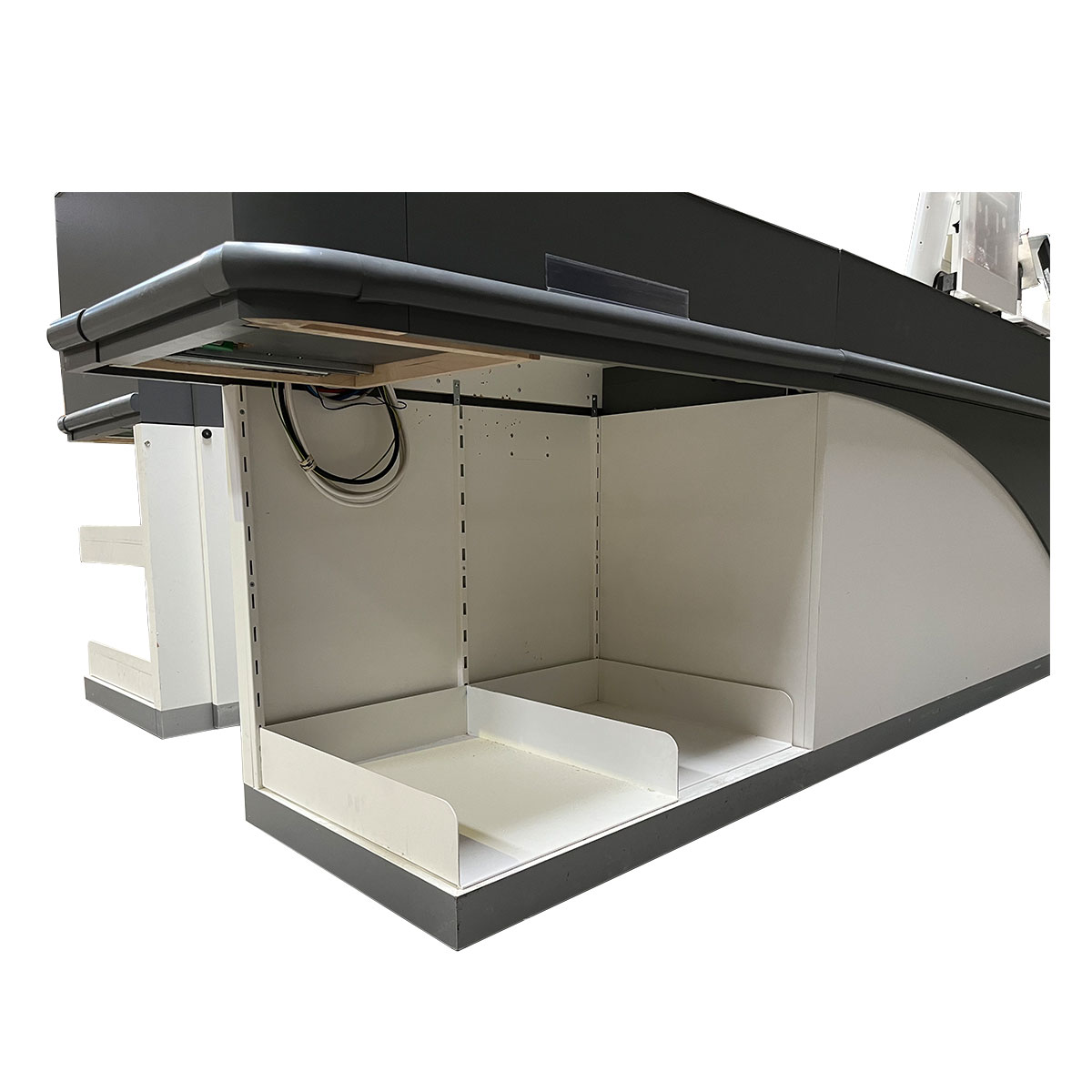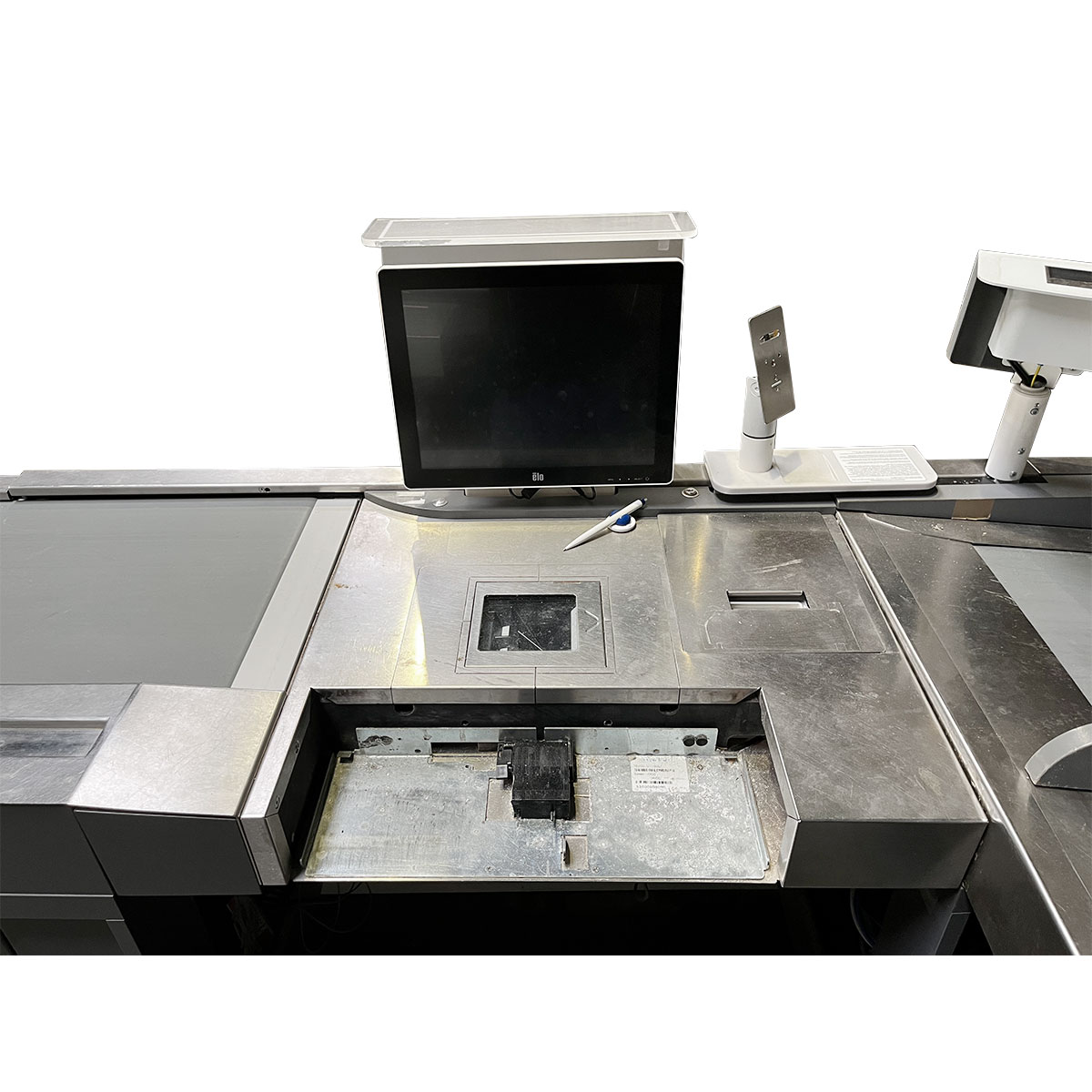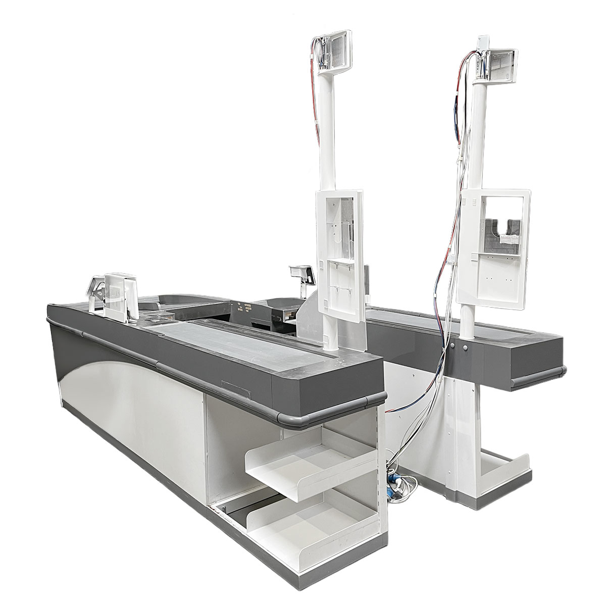Diese Tandem-Kassenanlage ist mit zwei Laufbändern ausgestattet – ideal zur gleichzeitigen Abfertigung von zwei Kundenströmen. Die beiden Laufbänder unterscheiden sich leicht in der Länge (1.700 mm und 1.320 mm) und sind so aufgestellt, dass ein effizienter Warenfluss gewährleistet ist. Beide Kassenseiten verfügen über großzügige Warenausgabe- und Ablageflächen, sodass die Kunden ihre Einkäufe bequem ein- oder auspacken können.