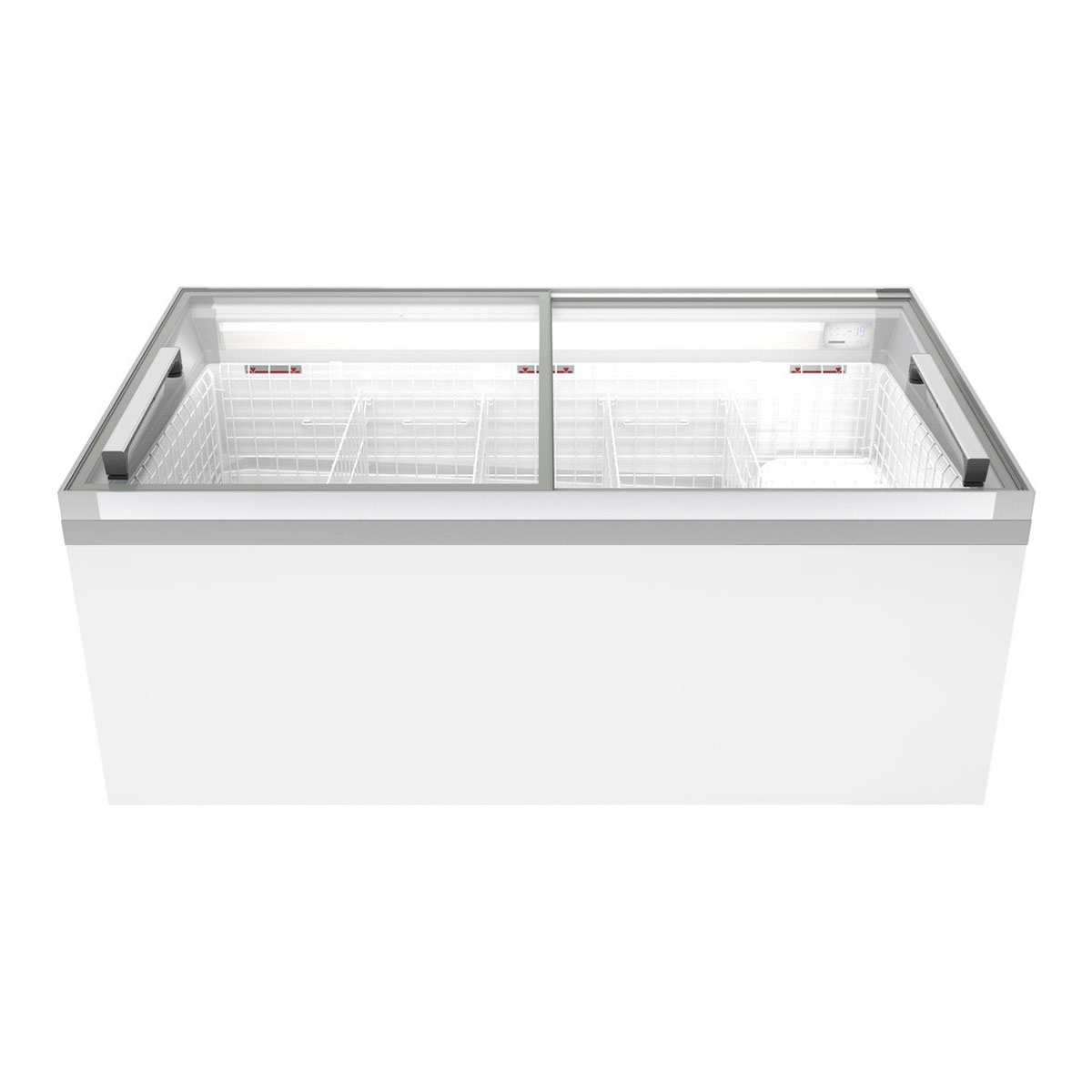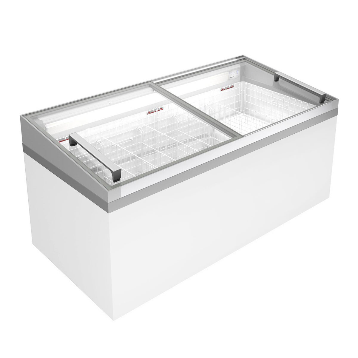 Das weiße Gehäuse der Tiefkühltruhe fügt sich harmonisch in jede Verkaufs- oder Lagerumgebung ein. Die Glasschiebedeckel bieten eine klare Sicht auf den Inhalt und erleichtern das schnelle Finden und Entnehmen von Produkten – ideal für den Einsatz in Supermärkten, Tankstellen oder Gastronomiebetrieben.