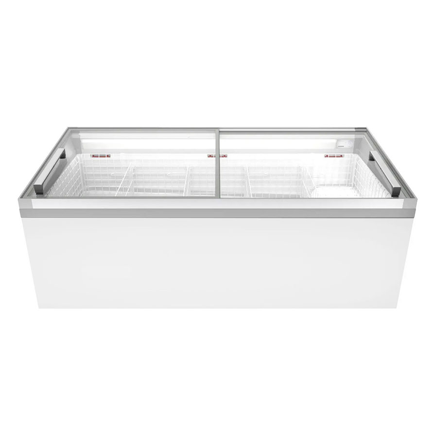 Die Tiefkühltruhe SGTm 972 präsentiert sich in einem klassischen weißen Design, das sich nahtlos in jede Verkaufsumgebung einfügt. Mit einer Länge von 2100 mm, einer Tiefe von 850 mm und einer Höhe von 890 mm bietet sie viel Platz zur übersichtlichen Lagerung von Tiefkühlprodukten. Dank ihrer großzügigen Kapazität können große Mengen an Waren problemlos untergebracht und optimal präsentiert werden.