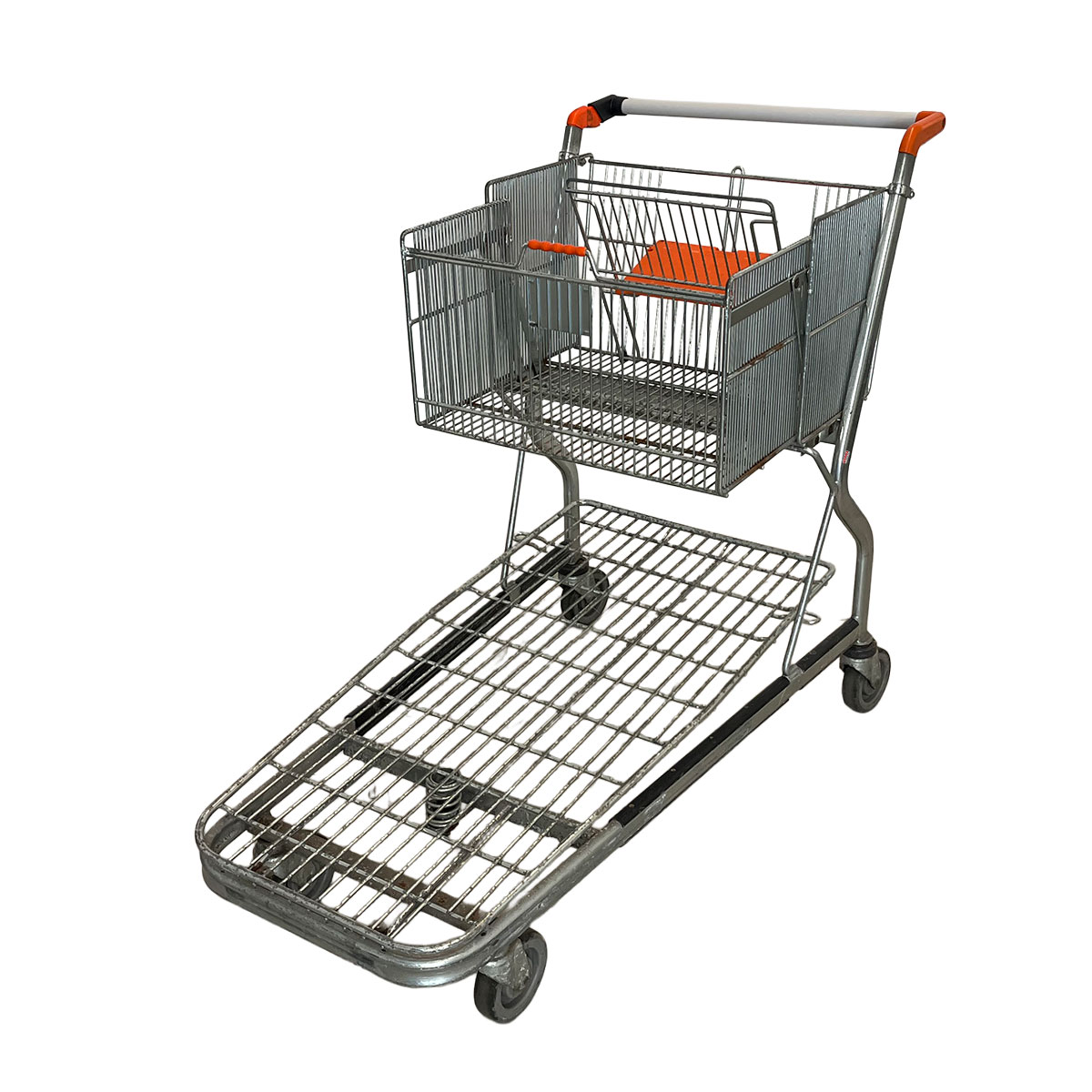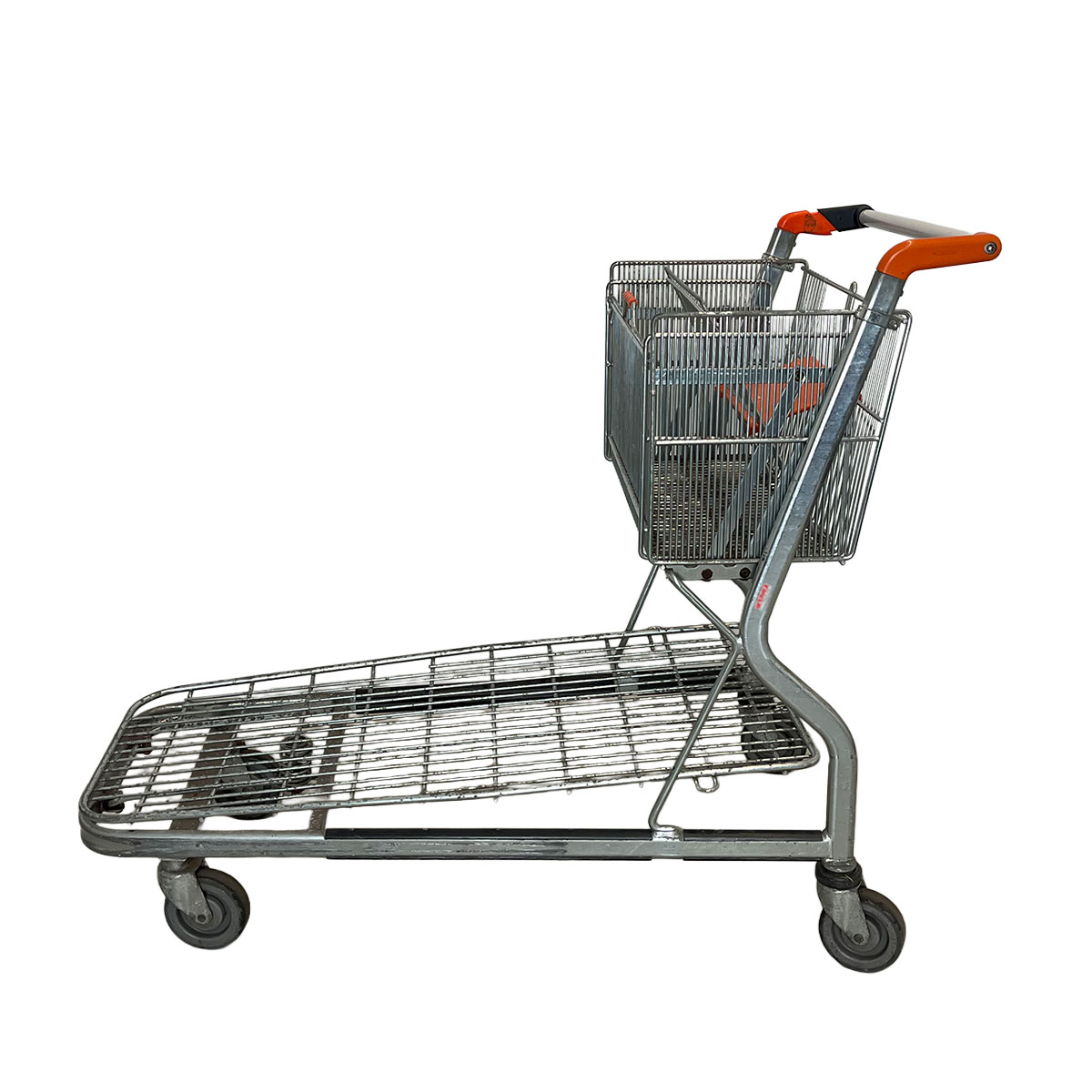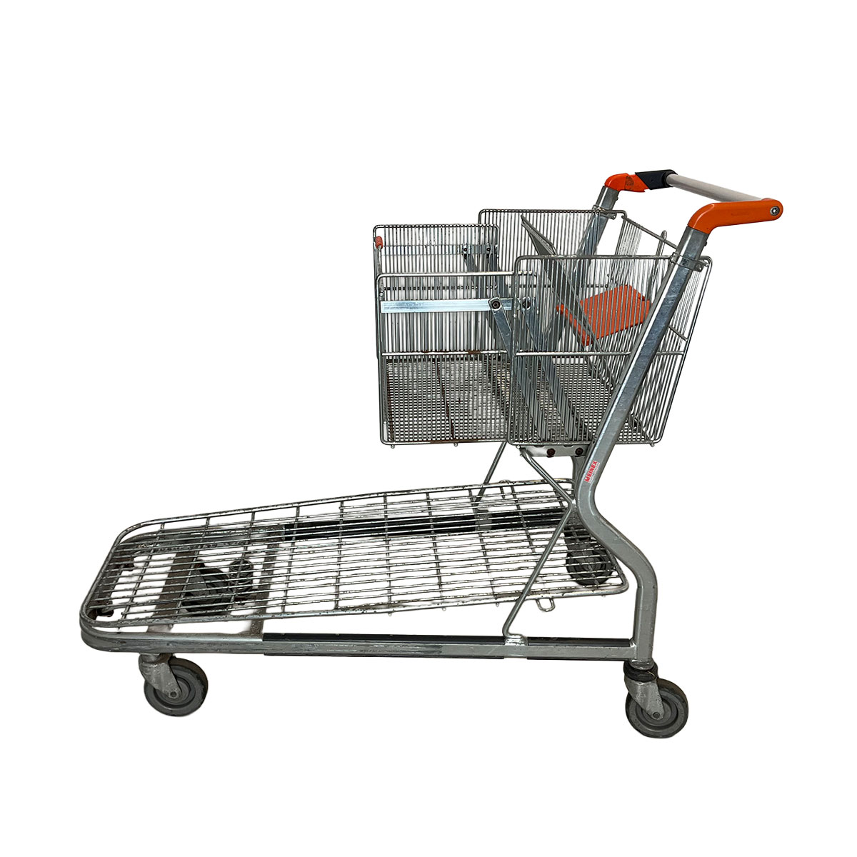 Eine integrierte Druckfeder unter der Plattform hebt die Transportfläche leicht an und ermöglicht ein besonders leises und leichtes Ineinanderschieben der Wagen – ideal für Supermärkte und Lagerbereiche mit viel Kundenverkehr.
