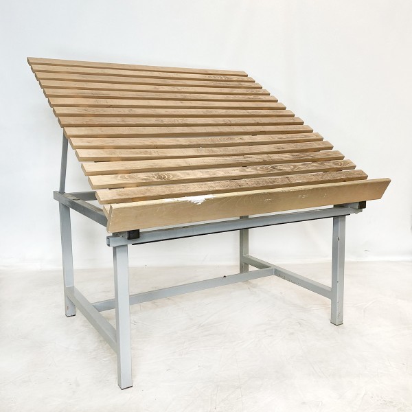 Dieser Warenpräsentationstisch ist für die Obst- und Gemüseabteilung geeignet. Der Tisch besteht aus einem Stahgestell und einer Holablage, ist stabil und in einem guten Zustand.