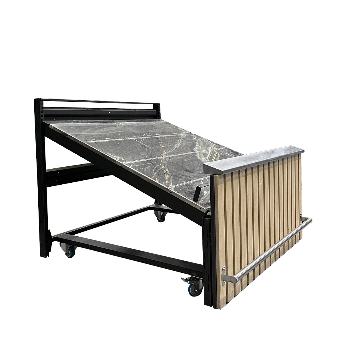 Die Obst- und Gemüseschräge verfügt über eine geneigte Ebene, die es Ihnen ermöglicht, eine Vielzahl von Obst- und Gemüsesorten übersichtlich und ansprechend zu präsentieren. Die geneigte Anordnung verbessert die Sichtbarkeit der Produkte und erleichtert den Zugang für die Kunden.