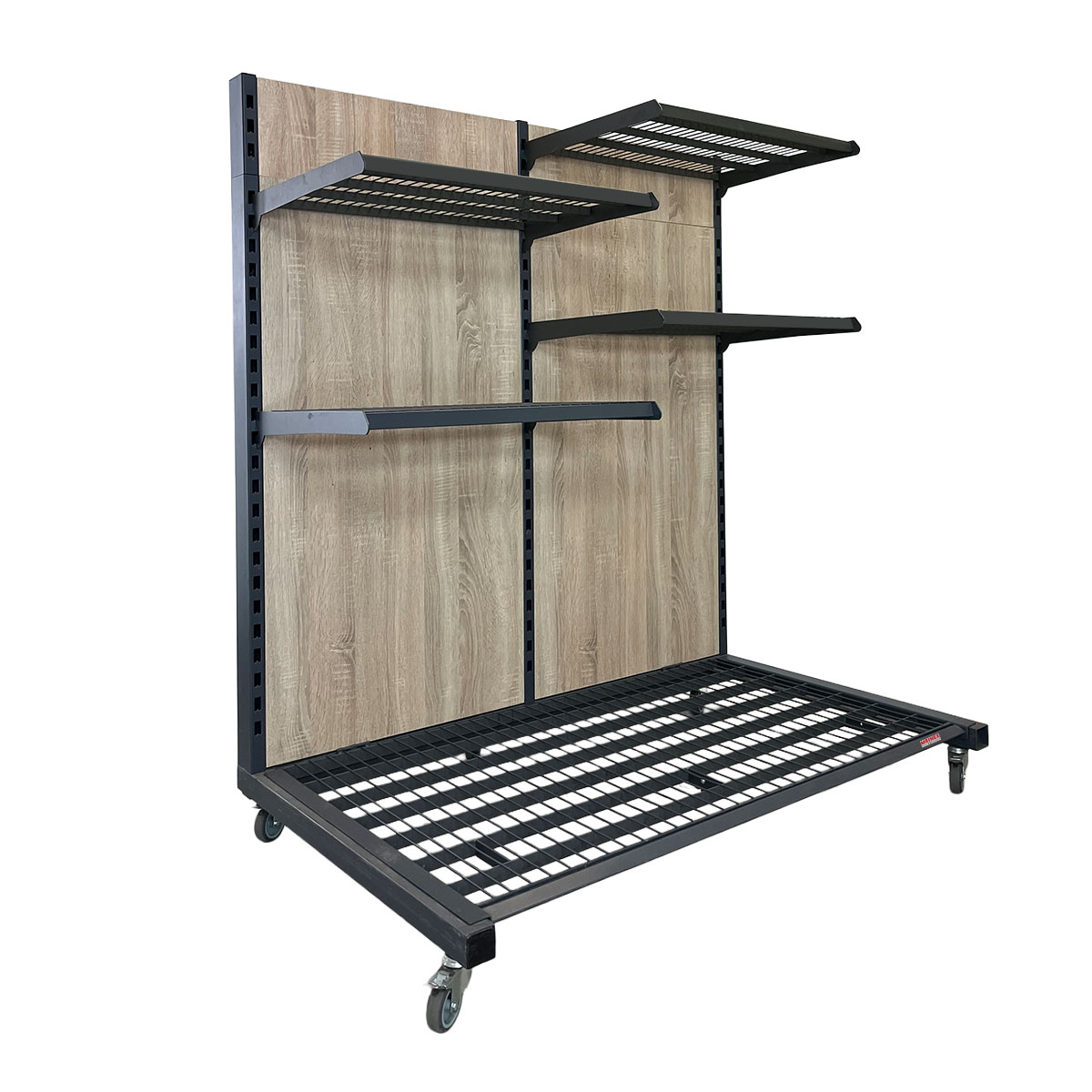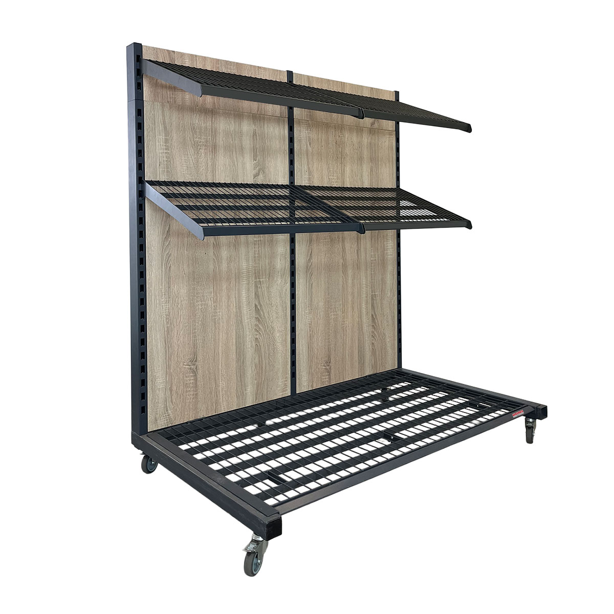 Warenpräsenter fahrbar – robuster Verkaufsständer mit Holzrückwand & 290 kg Tragkraft