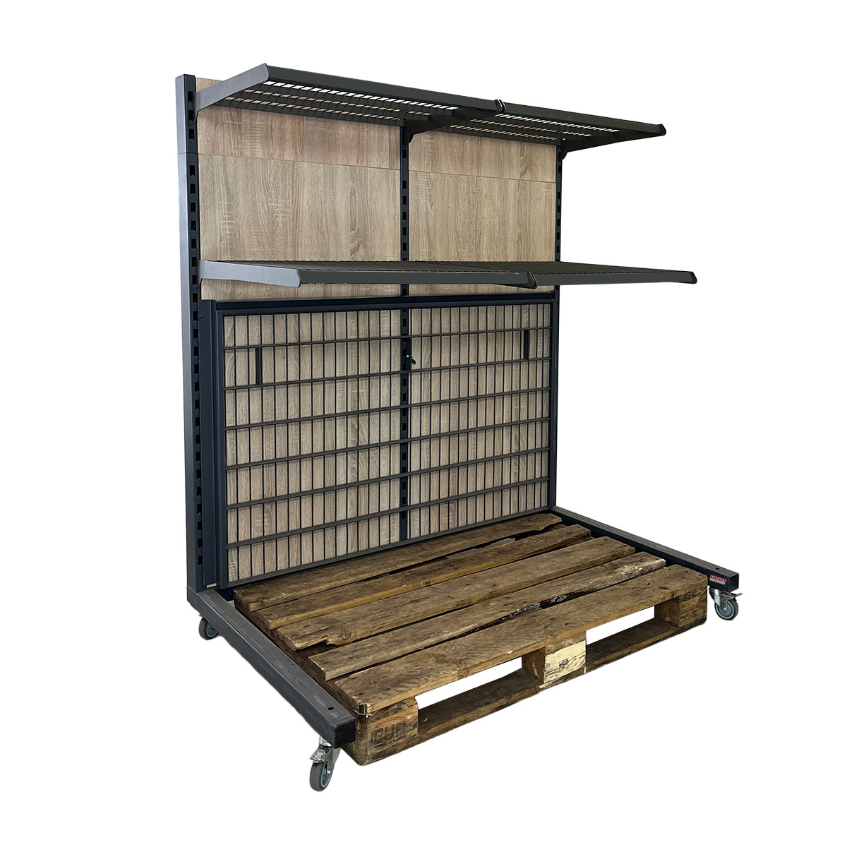 Der Bodenrost ist hochklappbar, sodass eine Europalette direkt im unteren Bereich platziert werden kann. Dadurch eignet sich der Warenpräsenter hervorragend für kombinierte Präsentationen aus Regal- und Palettenware – ideal für Aktionen und Mengenartikel.